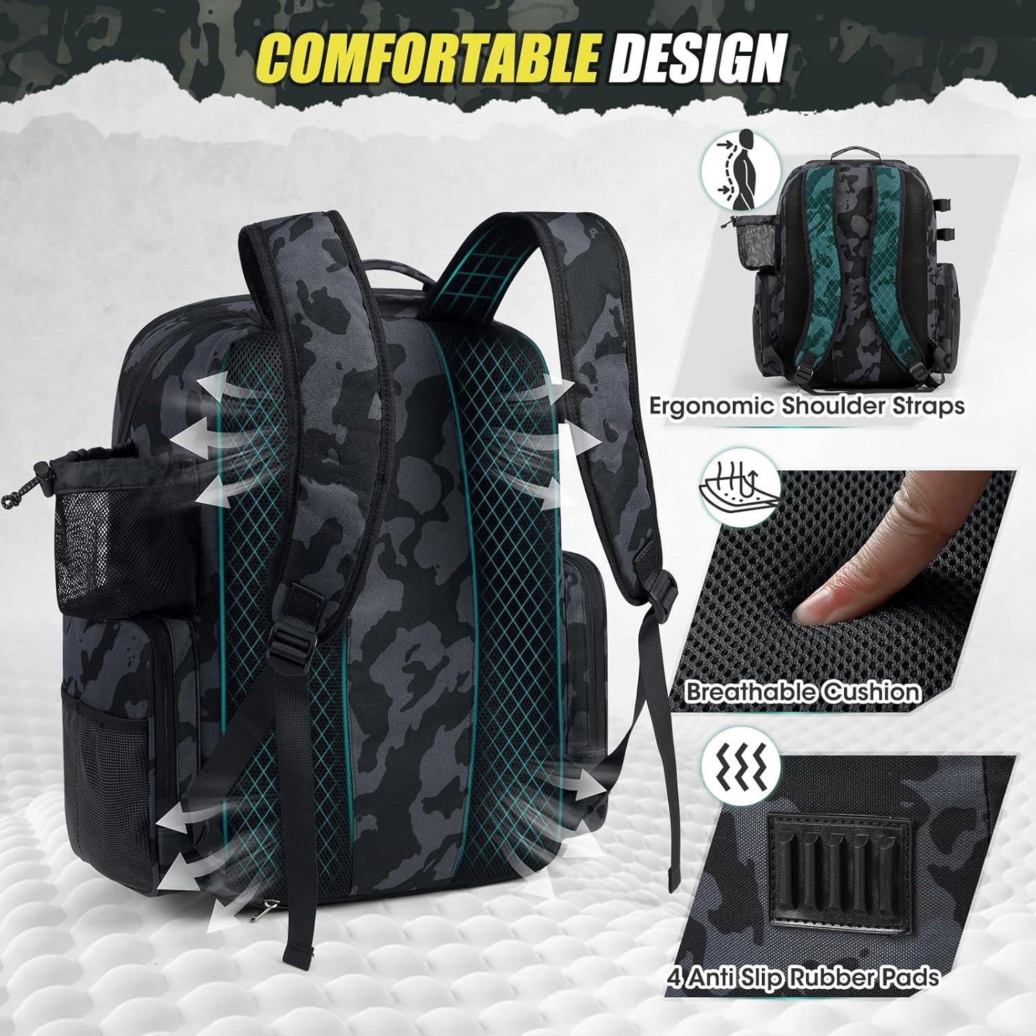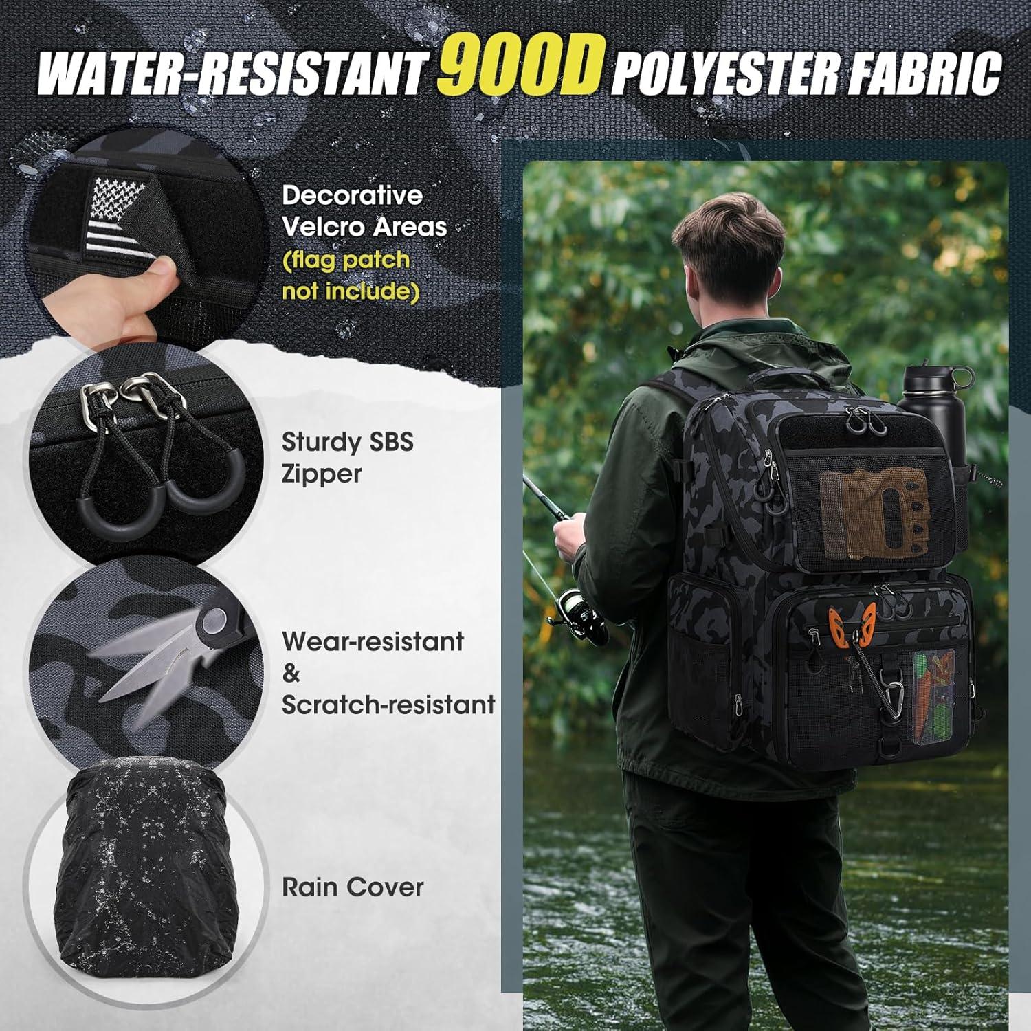 【WATERPROOF AND DURABLE FISHING BACKPACK】Made of high-density 900D polyester, this fishing tackle backpack has superior long-term performance and reliability. The water-resistant PVC coating ensures your belongings stay dry. Come with waterproof rain cover for double protection against tears, abrasion, and sudden downpours. 4 non-skid rubber feet on the bottom keep fishing bag firmly in place. Anti-rust SBS zippers and reinforced stitching ensures tackle backpack long-lasting durability.