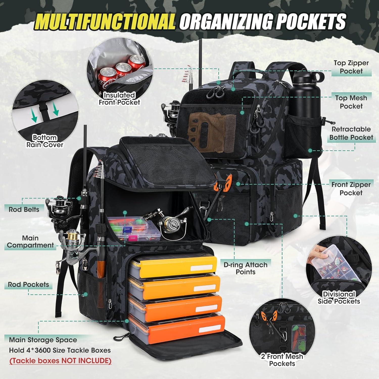 【MULTIPLE STORAGE SPACE】Fishing backpack contains 20+ dedicated pockets and storage areas that help all your fishing gear and accessories to stay organized. Large adjustable main compartment; Rod belts & rod holders; wet pockets; bottle pocket; side pockets; multiple mesh and zipper pockets; D-rings, etc. Each pocket is strategically placed for easy access, help you efficiently carry rods, pliers, fishing boxes, fishing tools, and all the essentials you need for a day of fishing.