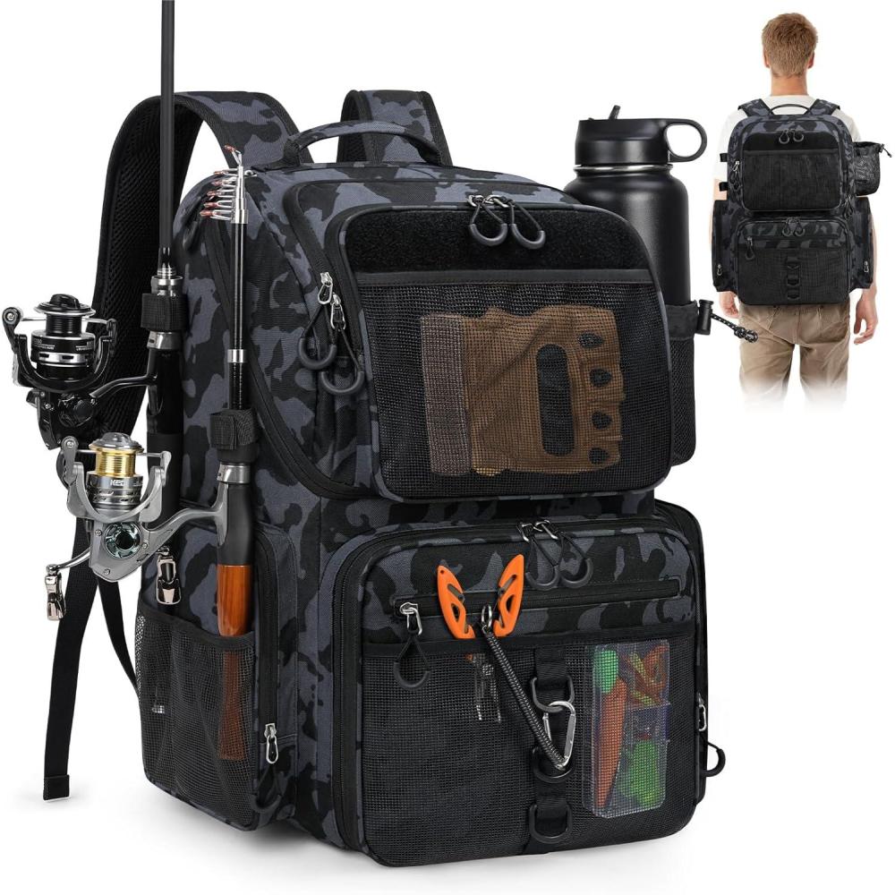 RAINSMORE 45L Fishing Backpack with Rod Holders & Rain Cover Large Water Resistant Fishing Tackle bag Store Fishing Gear(Black Gray Camouflage)