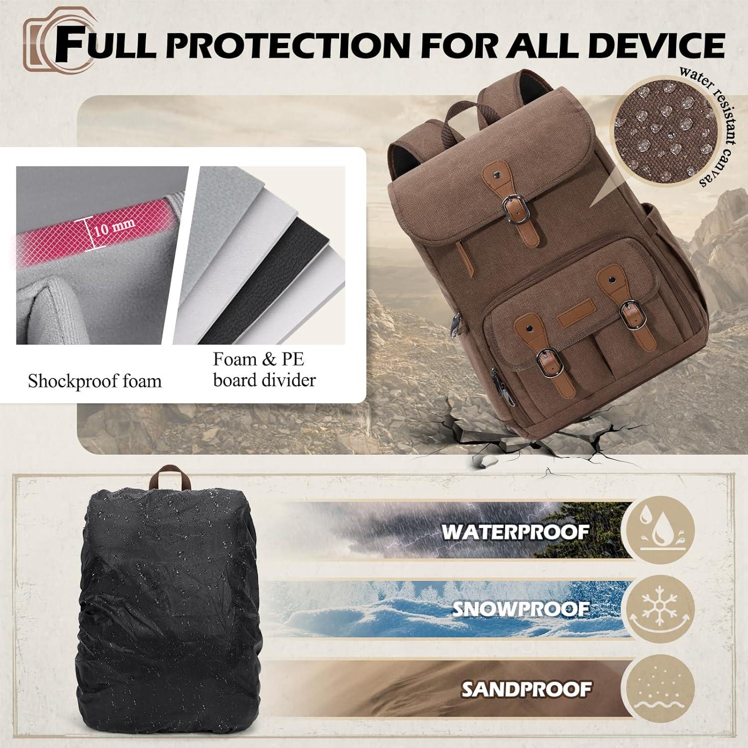 SUPERIOR CAMERA PROTECTION: Made from water-resistant and scratch-resistant canvas, equipped with a waterproof rain cover, this waterproof camera backpack provides dual protection for your precious photography accessories from any unexpected weather. Soft velvet lining and 360°padded cushioning of the photography backpack ensure shock absorption and safeguard cameras, lenses, flash from impacts, scratches, and other potential damages.