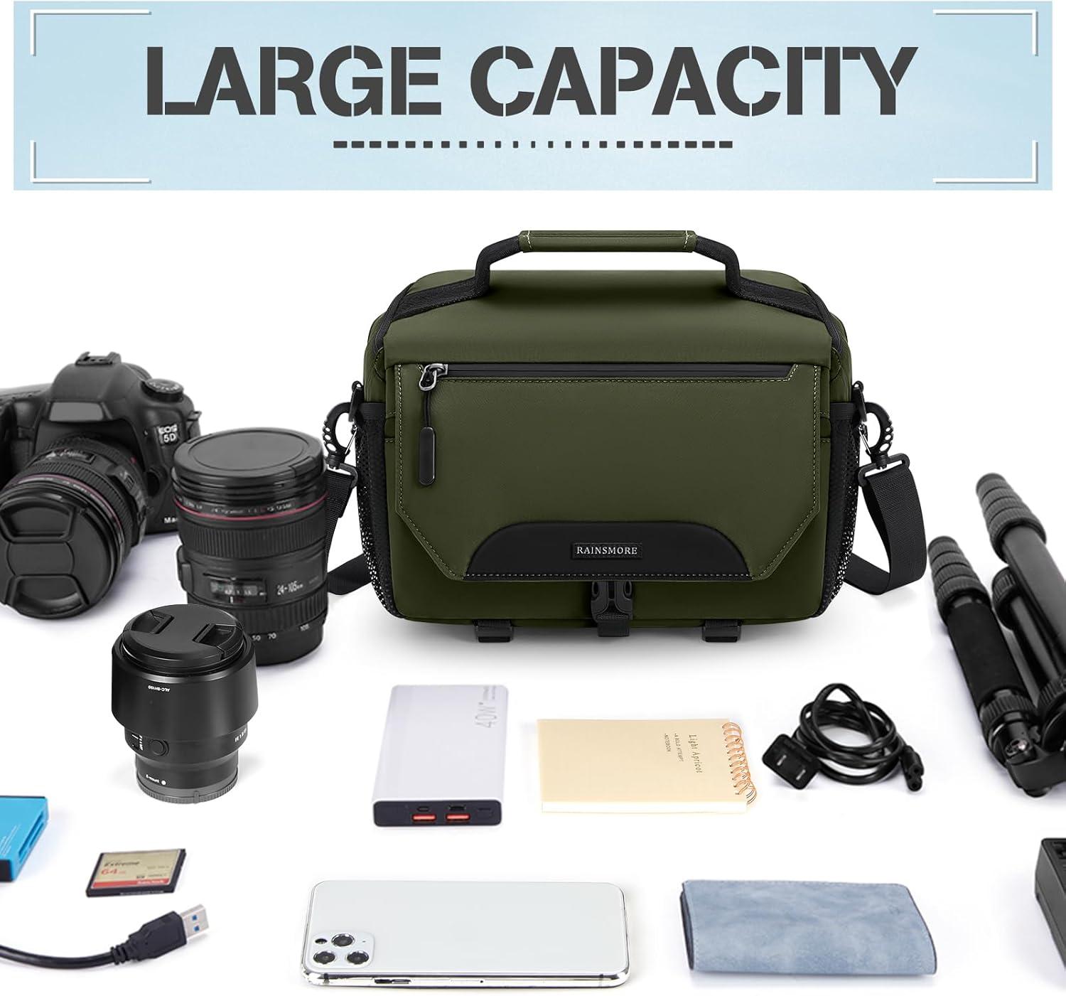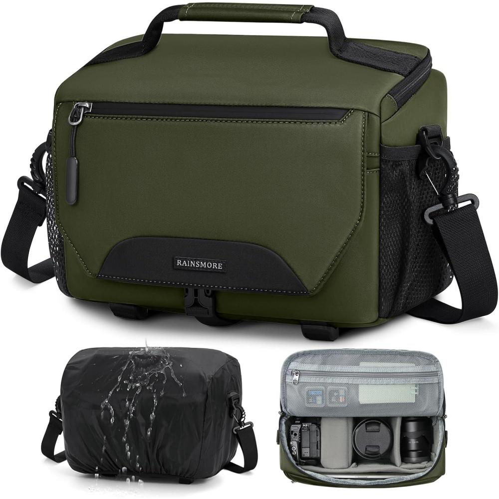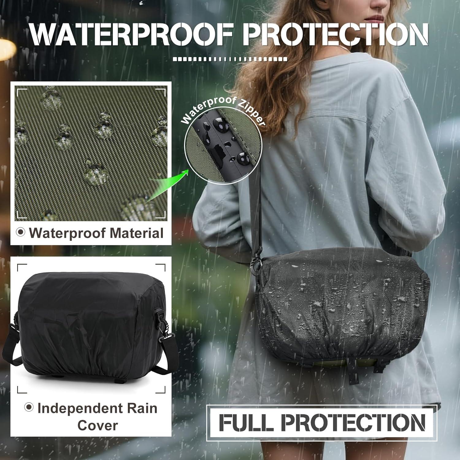 RAINSMORE Camera Bag, DSLR/SLR/Mirrorless Small Camera Sling Bag Waterproof Camera Case with Tripod Holder & Rain Cover Compact Crossbody Camera Bags for Photographers Everyday Shoulder Bags, Khaki(Green)
