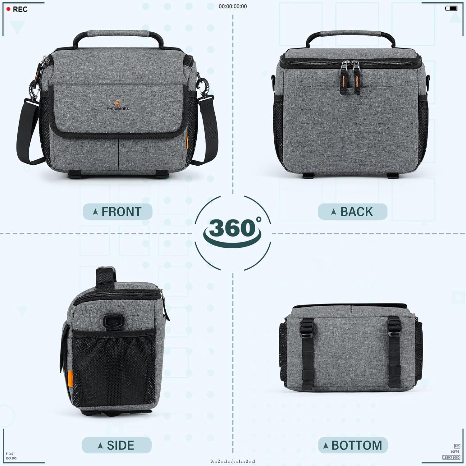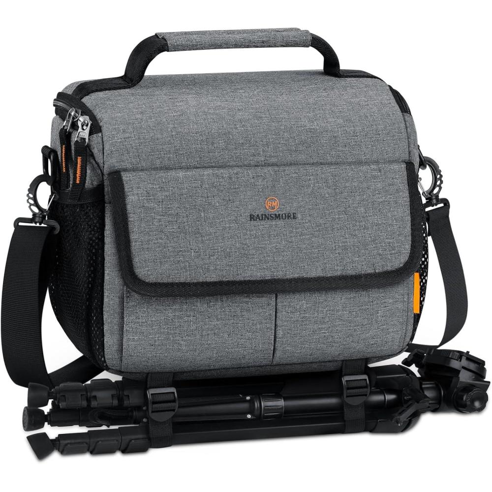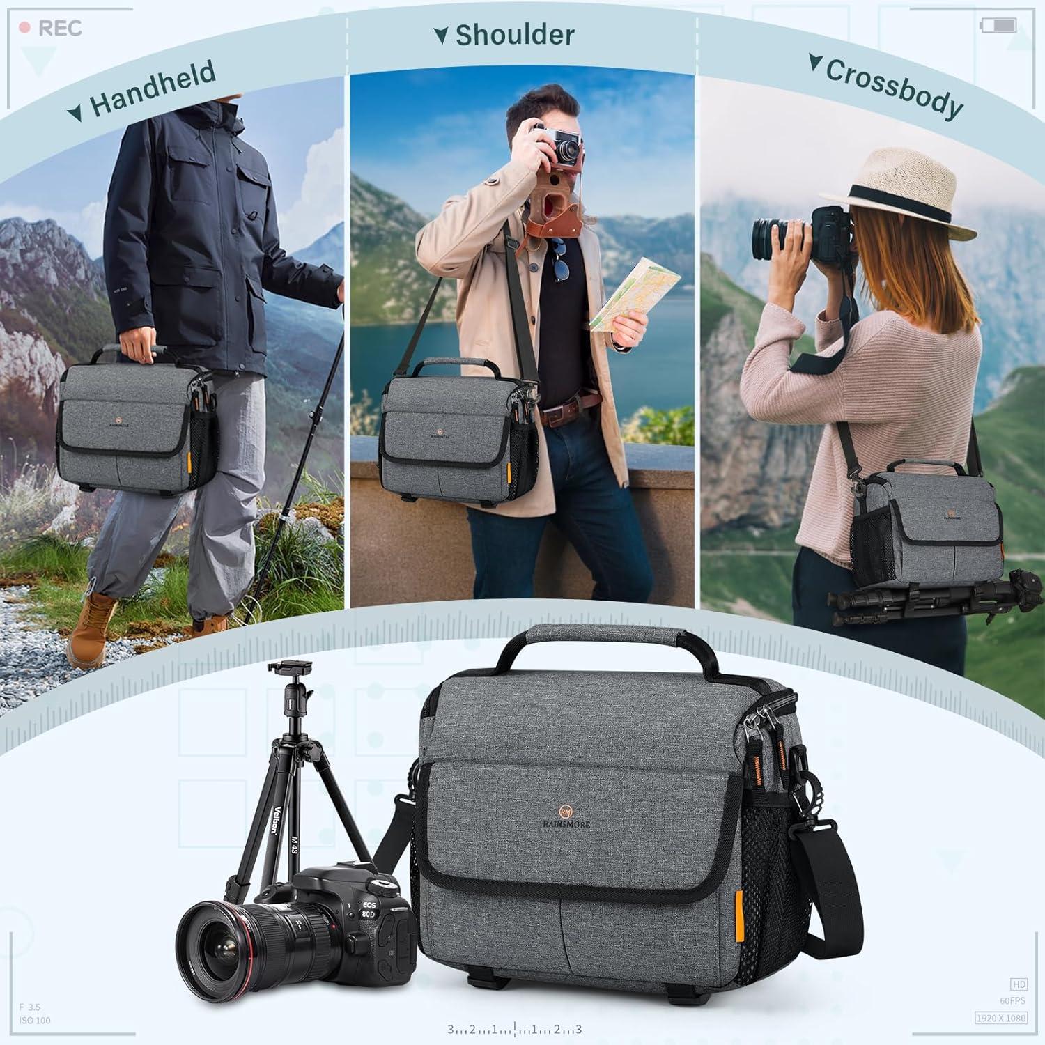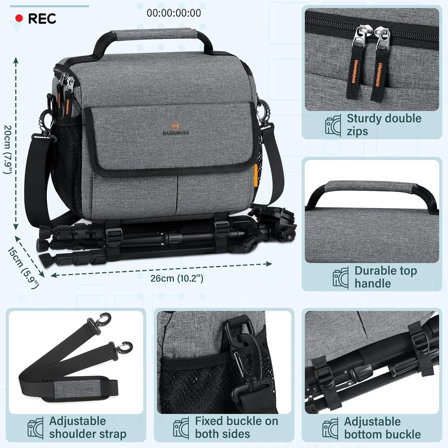 RAINSMORE Camera Bag for DSLR SLR Mirrorless Camera,Small Camera Sling Bag for Photographers Waterproof Camera Case with Tripod Holder Compact Camera Bag Crossbody with Rain Cover Black(Grey)