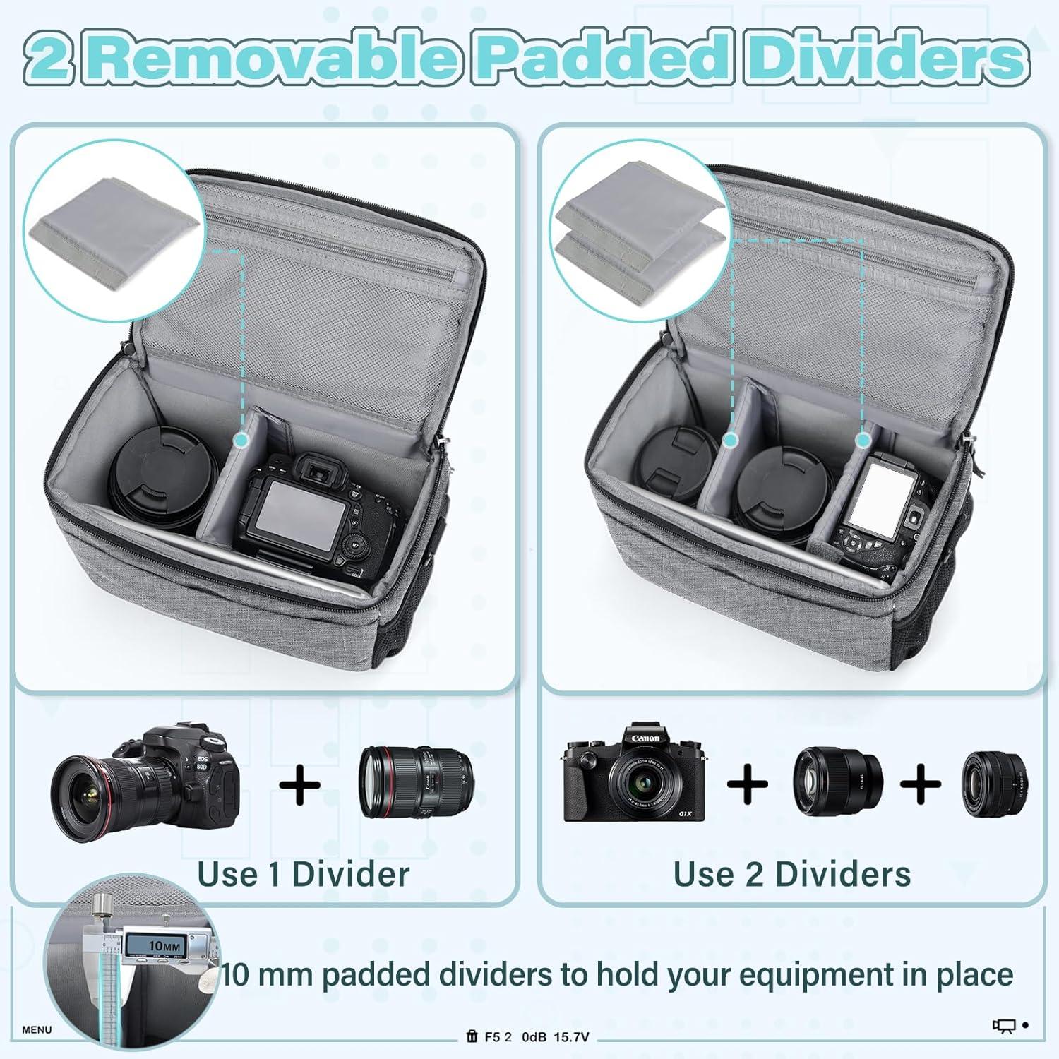 【PRACTICAL CAMERA BAG】 Includes 1 camera bag, 1 shoulder strap, 2 removable dividers and 1 rain cover. Adjustable shoulder strap can make your shoulder more comfortable, the compact camera case is lightweight and convenient, very easy to carry and reduce stress for your traveling. Meanwhile, this camera bag can also be used as a camera bag crossbody, shoulder bag or handbag, very practical and ideal for daily trips and travels, it is also a perfect gift for family, friends or photographers.