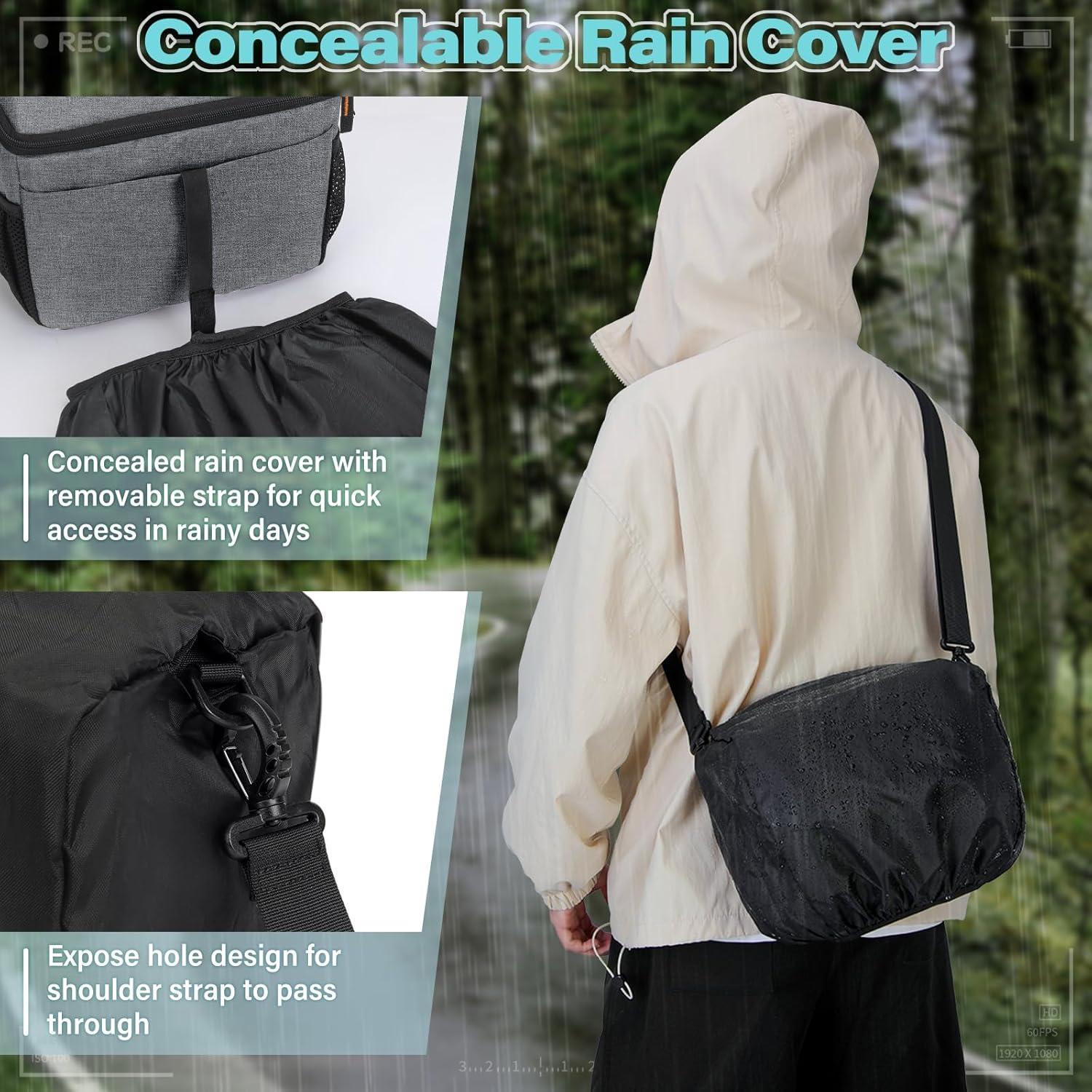 【CAMERA PROTECTION】The camera protection system of the all-in-one camera bag consists of 10mm thick soft padding on the inside and durable, tear-resistant woven fabric on the outside, effectively protecting the camera as well as other accessories from impacts or scratches. All exterior fabrics are treated to make them waterproof, and a rain cover is also provided in case of inclement weather conditions. (However, it is not an underwater case, please do not put it in water or pouring rain.)