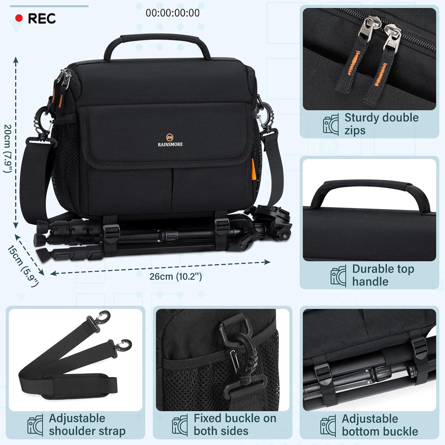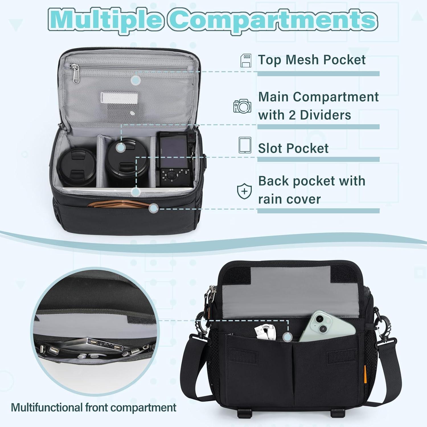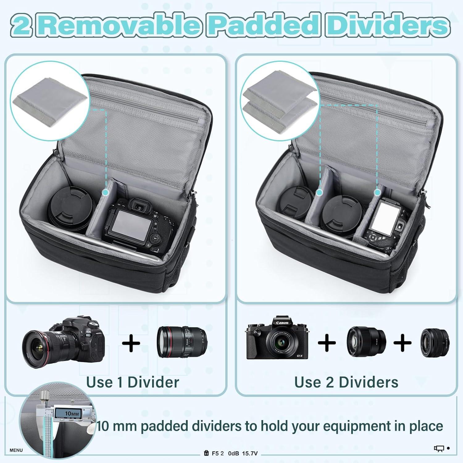 【PRACTICAL CAMERA BAG】 Includes 1 camera bag, 1 shoulder strap, 2 removable dividers and 1 rain cover. Adjustable shoulder strap can make your shoulder more comfortable, the compact camera case is lightweight and convenient, very easy to carry and reduce stress for your traveling. Meanwhile, this camera bag can also be used as a camera bag crossbody, shoulder bag or handbag, very practical and ideal for daily trips and travels, it is also a perfect gift for family, friends or photographers.