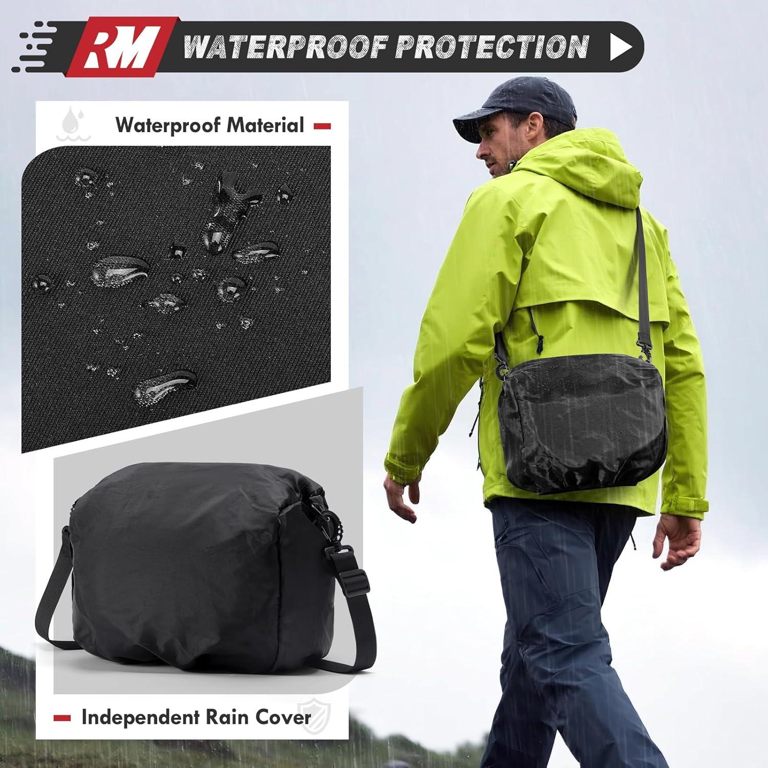 360°Camera Protection & Waterproofing: This waterproof camera bag features an outer layer of waterproof nylon fabric, an interior filled with 10mm thick foam, and a soft velvet lining, effectively protecting your camera equipment from impacts and shocks. The sling camera bag also comes with a black rain cover to ensure your equipment's safety even in harsh weather conditions, protecting it from splashes or heavy rain.