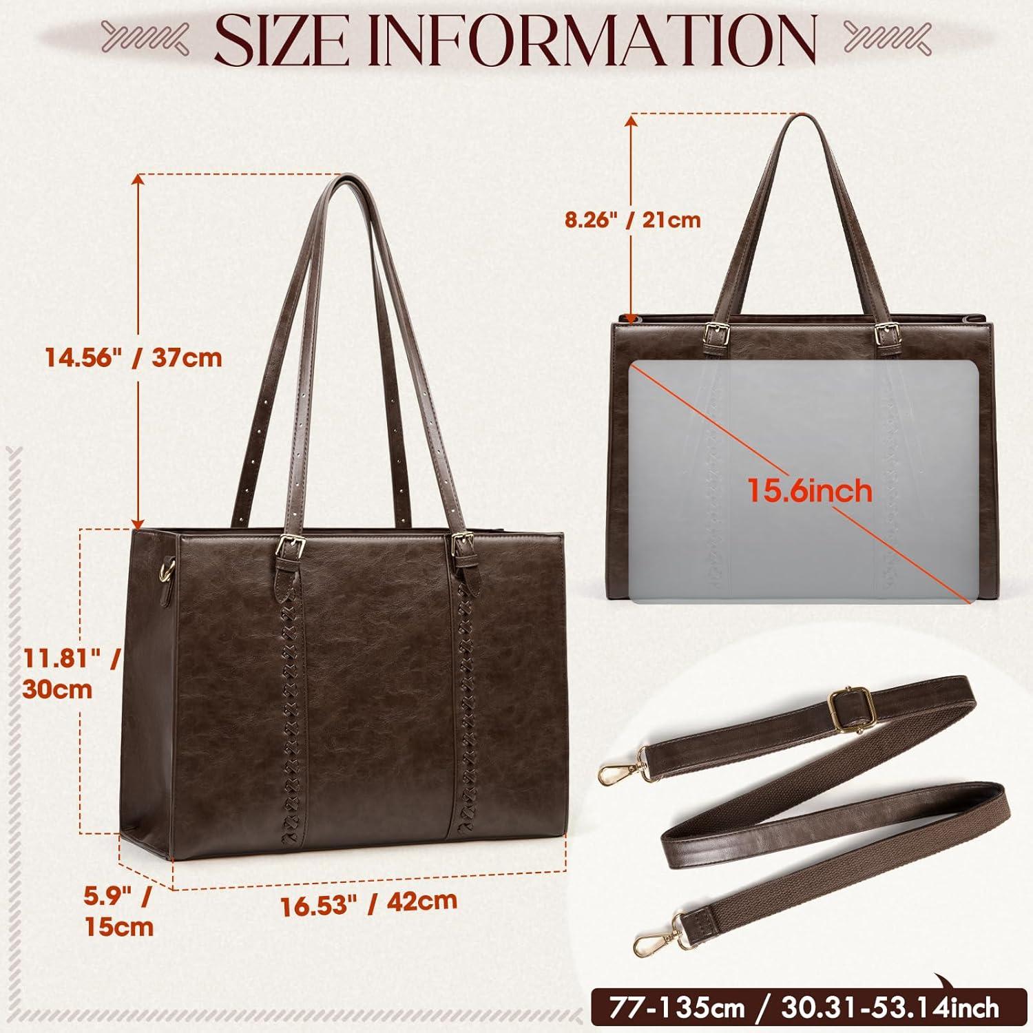 PERFECT SIZE WORK BAG:Work bags for women is 16.53″*5.9″*11.8″(L*W*H). Net weight: 2.05 lb. Handle drop: 8.26-14.56''. The adjustable shoulder strap is 30.31-53.14 inches long. Suitable for most 13″/14″/15″/15.6″ laptops. Our perfect-sized work tote bag isn't just limited to the office. It seamlessly transitions from work to after-work activities, making it suitable for meetings, presentations, and even casual outings. Embrace versatility without compromising on style and functionality.