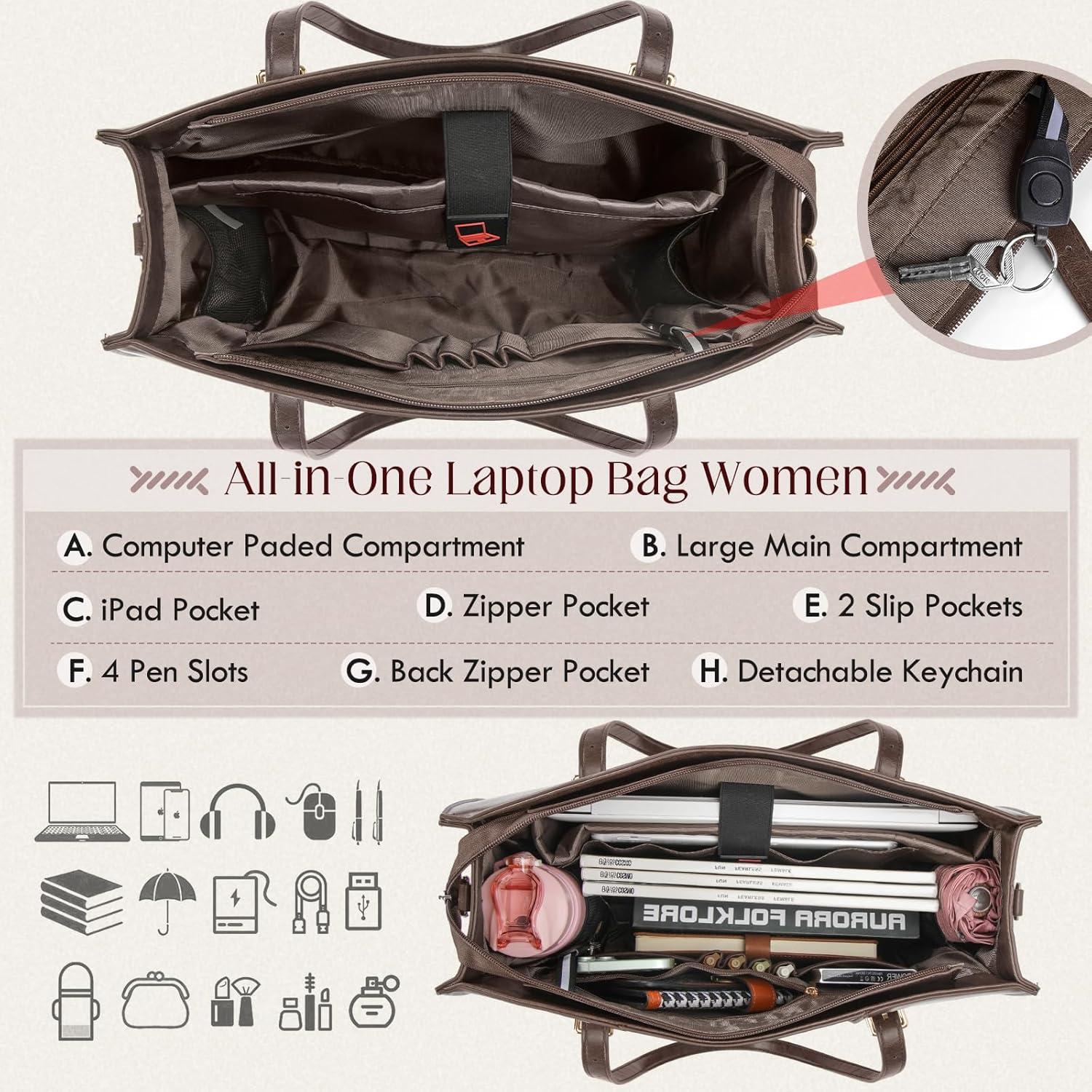 VERSATILE LAPTOP BAG FOR WOMEN:With adjustable handles and a removable long shoulder strap, you can transform it into different carrying methods according to your needs and venue, such as changing into a women's briefcase, teacher tote bag, computer shoulder handbag, or crossbody work bag that is suitable for office, college, shopping, parties, travel, and various occasions. It‘s also a perfect choice for anniversaries, birthdays, Mother’s Day, Valentine’s Day, and Christmas.