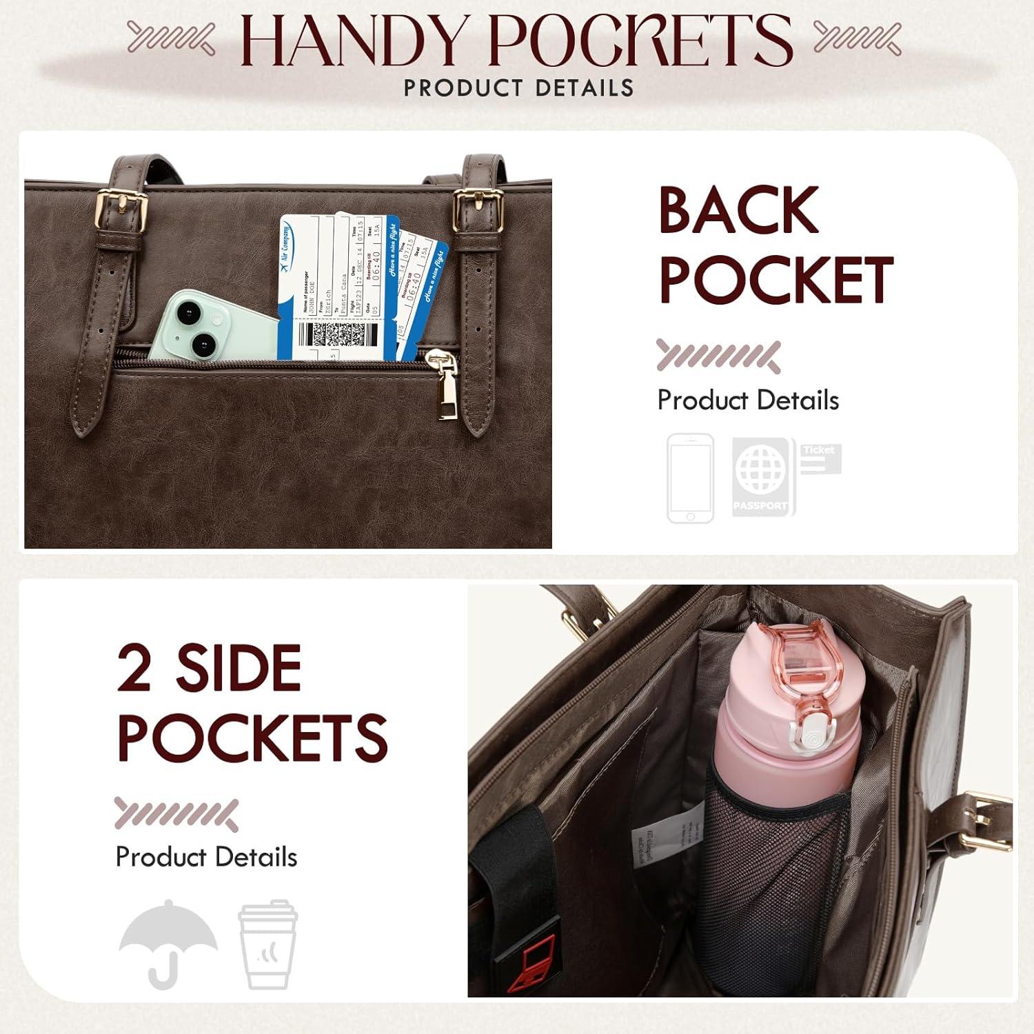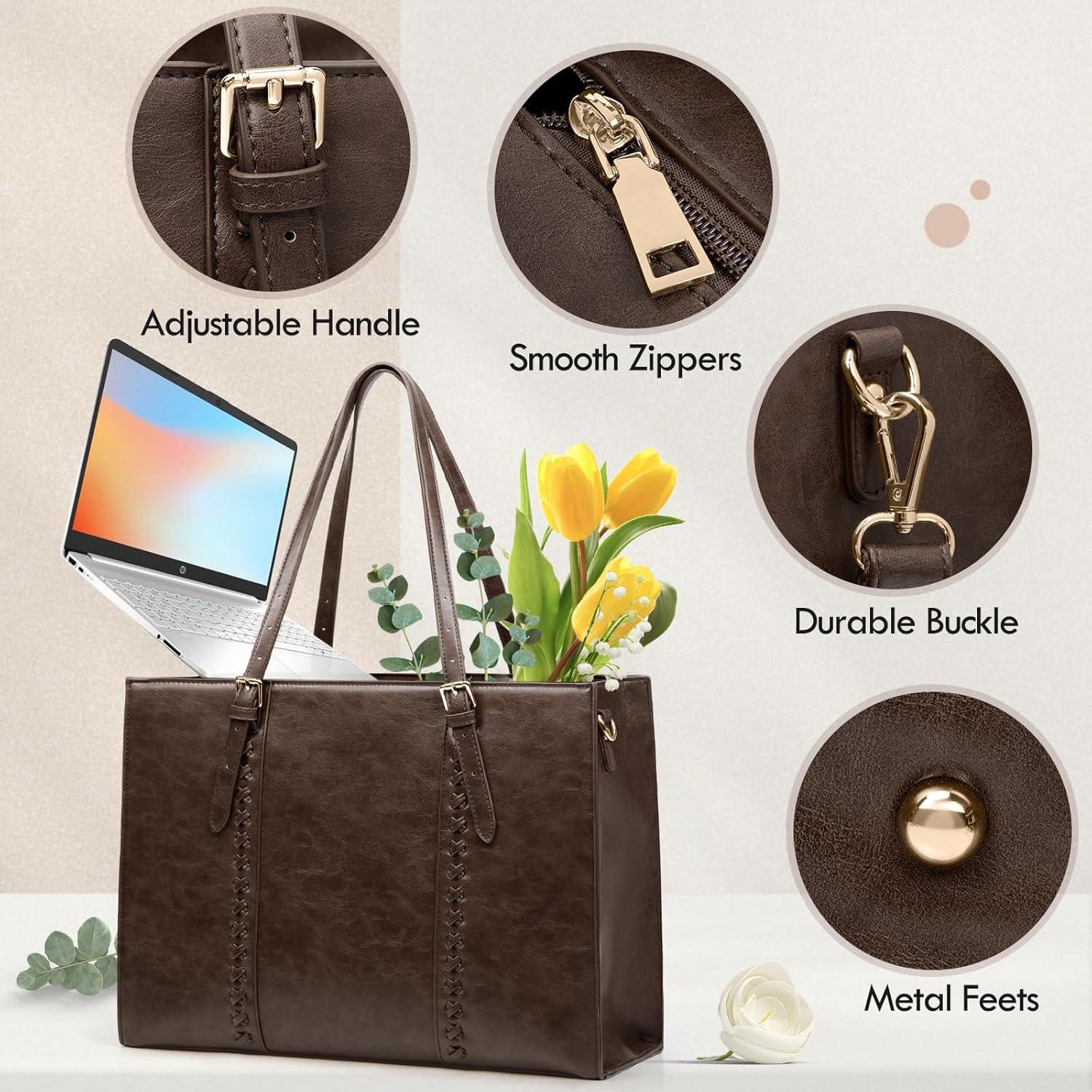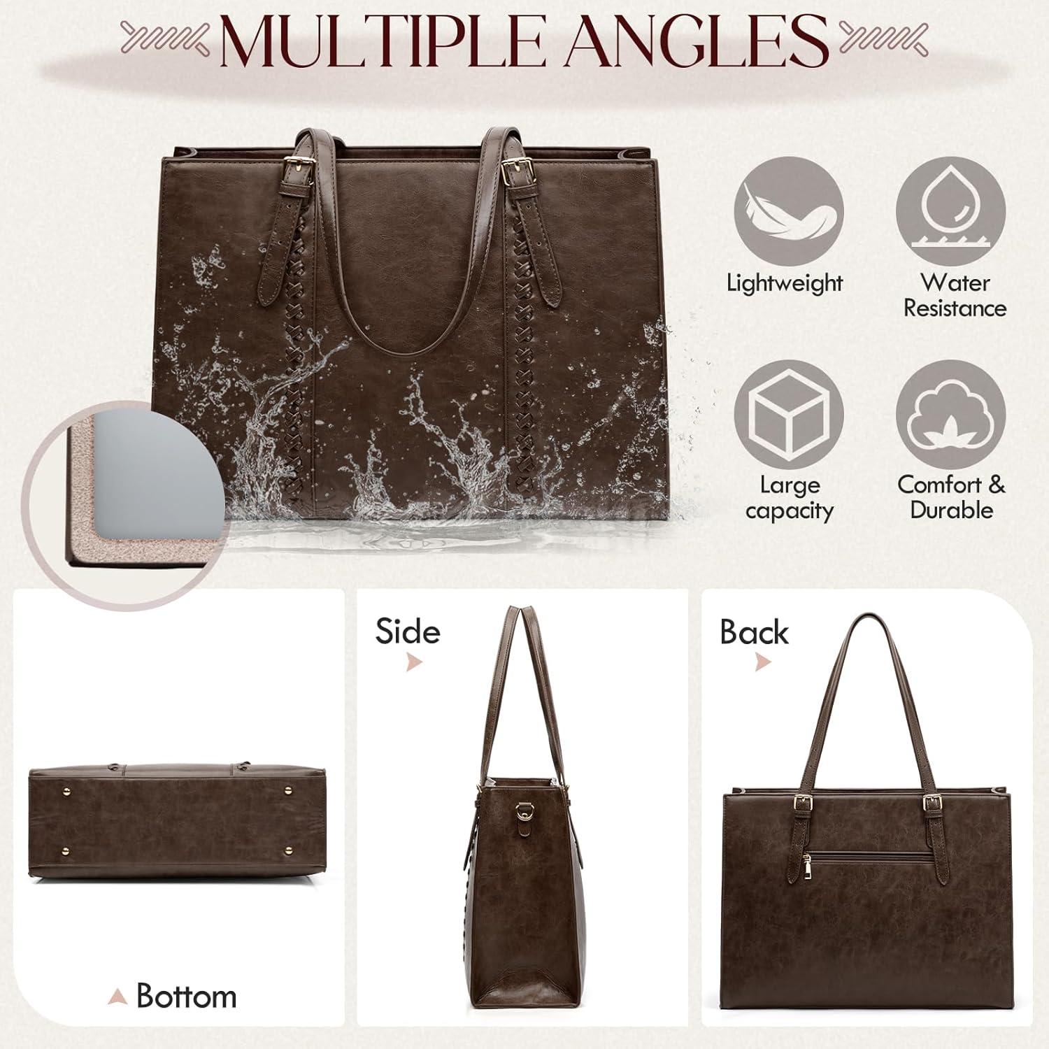 WATERPROOF MATERIAL & DURABILITY:Laptop bag for women is made of high-quality PU leather and soft nylon lining, this laptop tote bag is water-resistant, and scratch-resistant. The reinforced flat bottom design keeps it stable and upright even when not fully loaded. Besides, The four metal feet and the robust metal hardware ensure the bag remains in excellent condition, even with frequent use. Smooth zippers and reinforced stitching enhance the computer bag's durability and reliability.