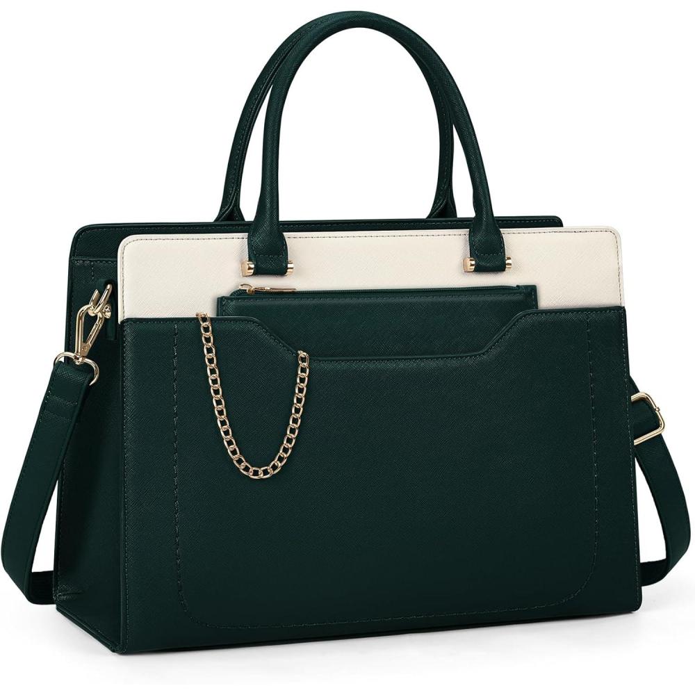 RAINSMORE Laptop Bag for Women 15.6 Inch Laptop Tote Bag Waterproof Leather Work Bags Professional Computer Briefcase Large Capacity Handbag for Business Teacher Office, Black(Green and White)