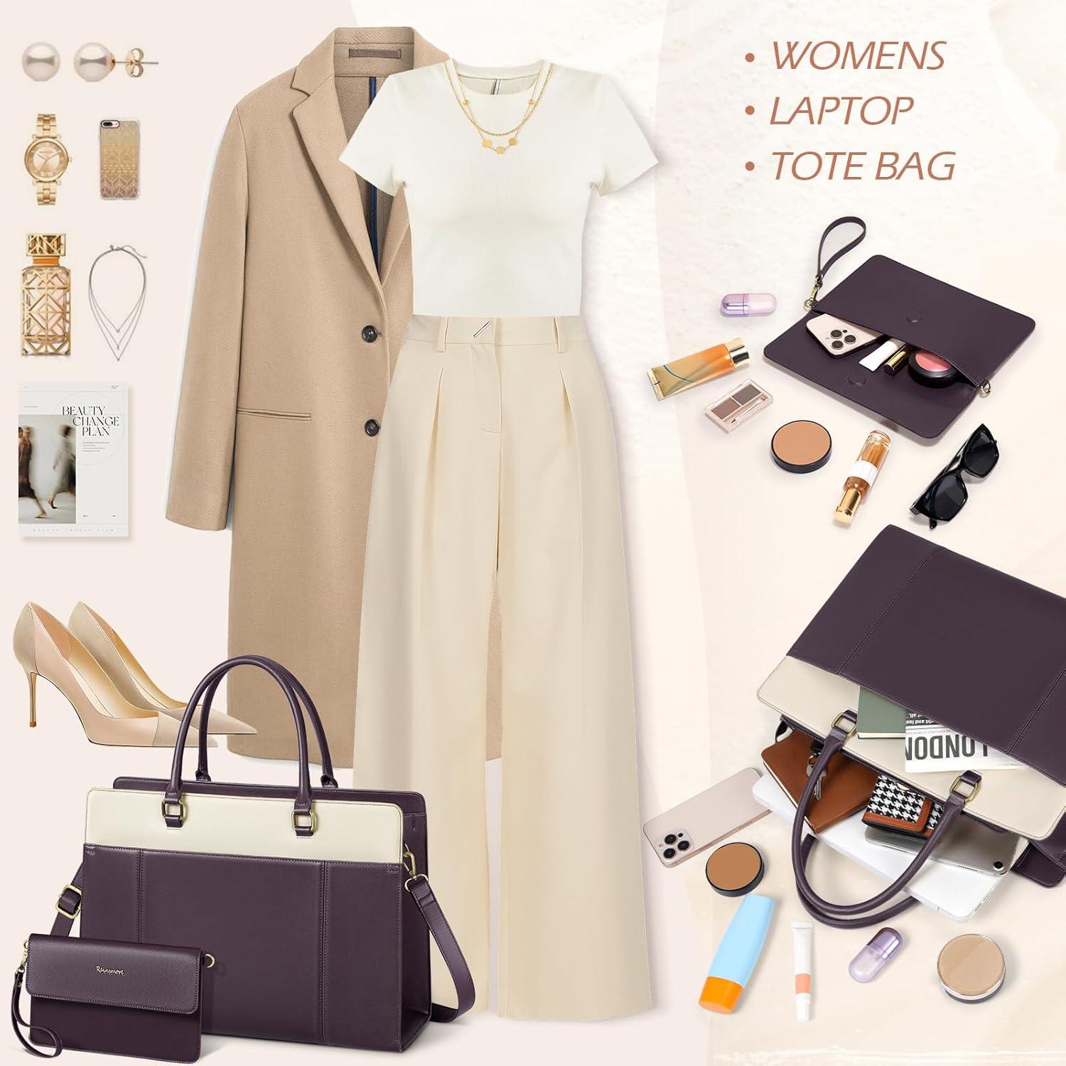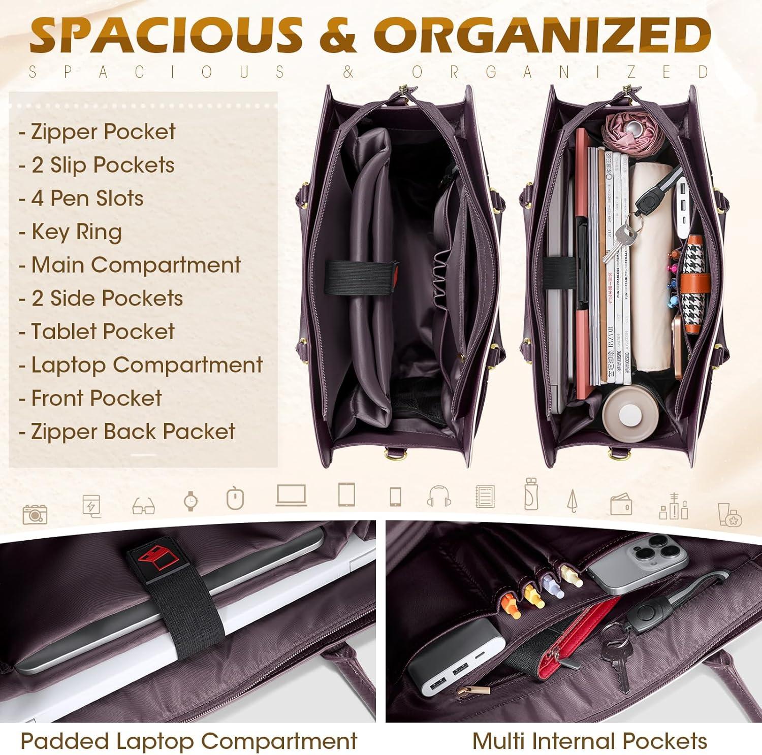 Built for everyday use: Scratch-resistant PU leather wipes spills clean and resists rain. Four metal feet protect the bottom and a hidden anti-theft zip secures cards and cash. Inside, thick foam padding protects laptops from knocks and bumps, while reinforced stitching withstands heavy use.From busy office hours to the unexpectedly rainy commute, this women's work bag stays in perfect condition.