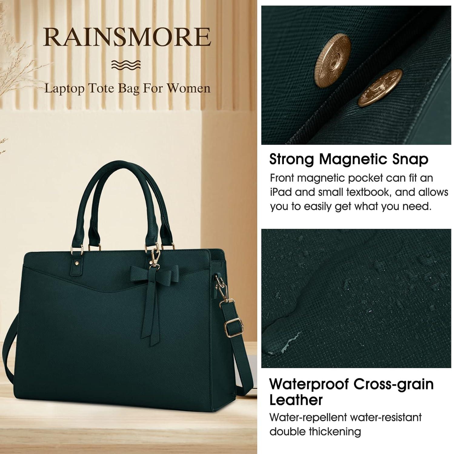 RAINSMORE Laptop Bag for Women 15.6 Inch PU Tote Bag Business Office Work Bag Waterproof Briefcase Computer Tote Lightweight Handbag Shoulder, Black(Dark Green)