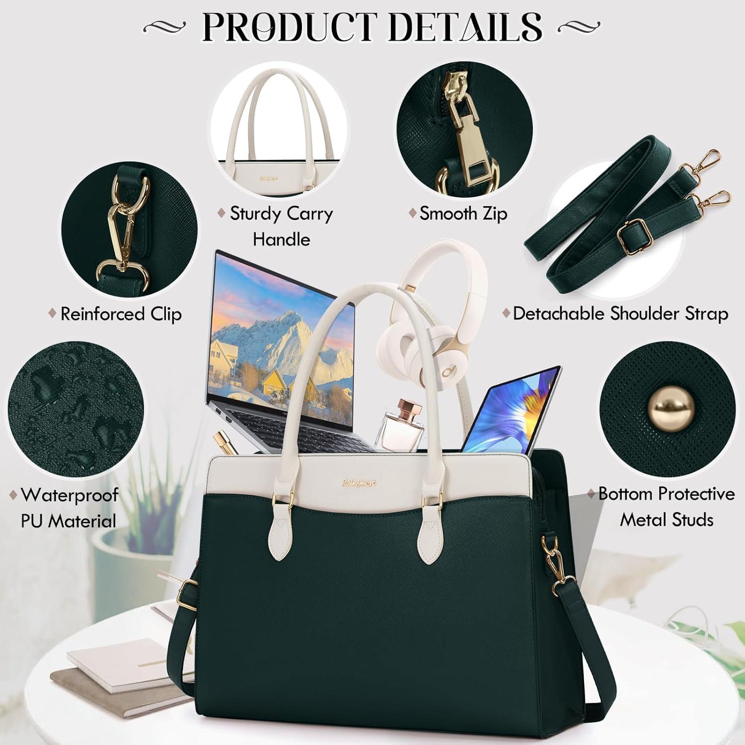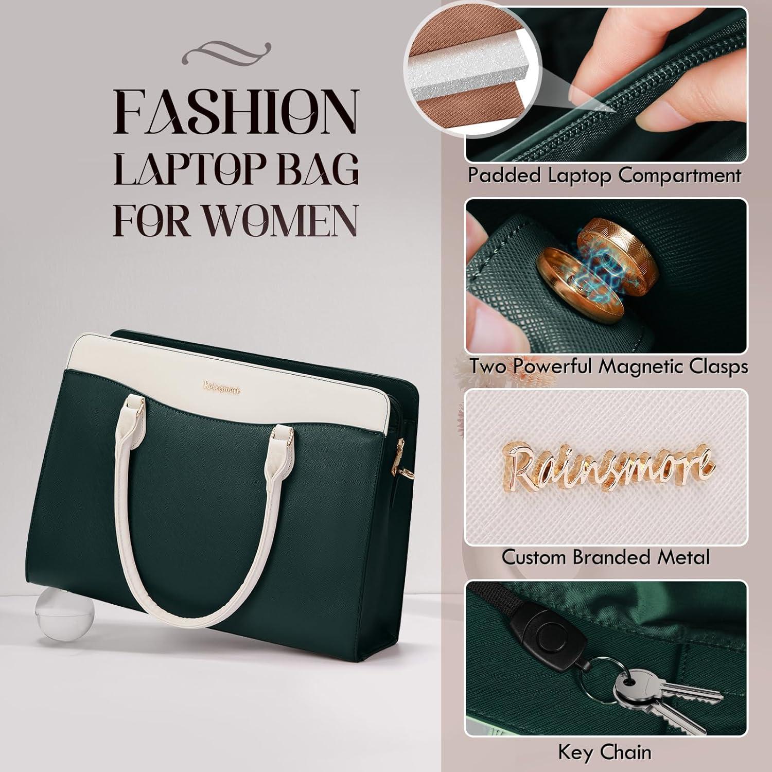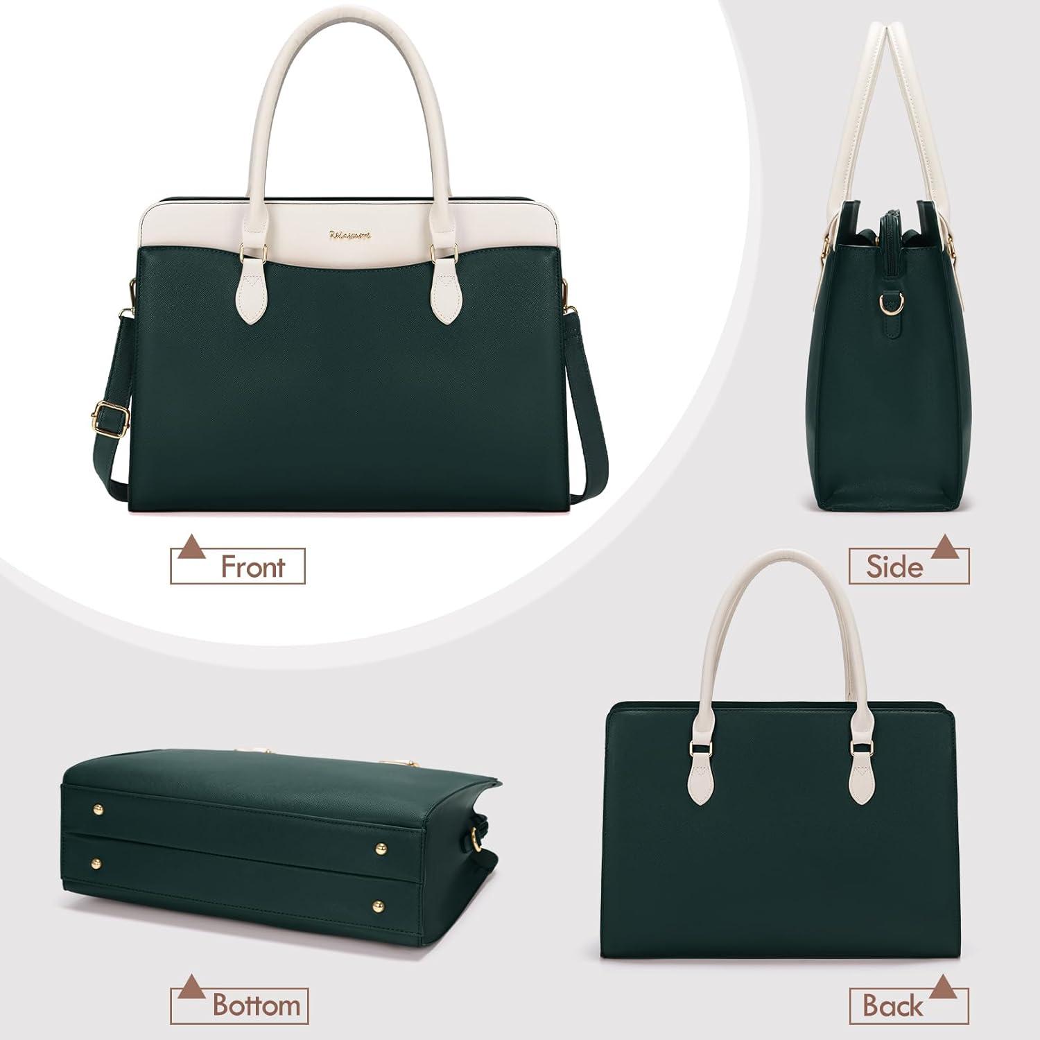imageRAINSMORE Laptop Bag for Women 156 Inch Waterproof PU Leather Work Tote Bags Large Laptop Purse for Women Professional Womens Briefcase Computer Bags for Business Office Teacher Black ampamp WhiteDark Green  White