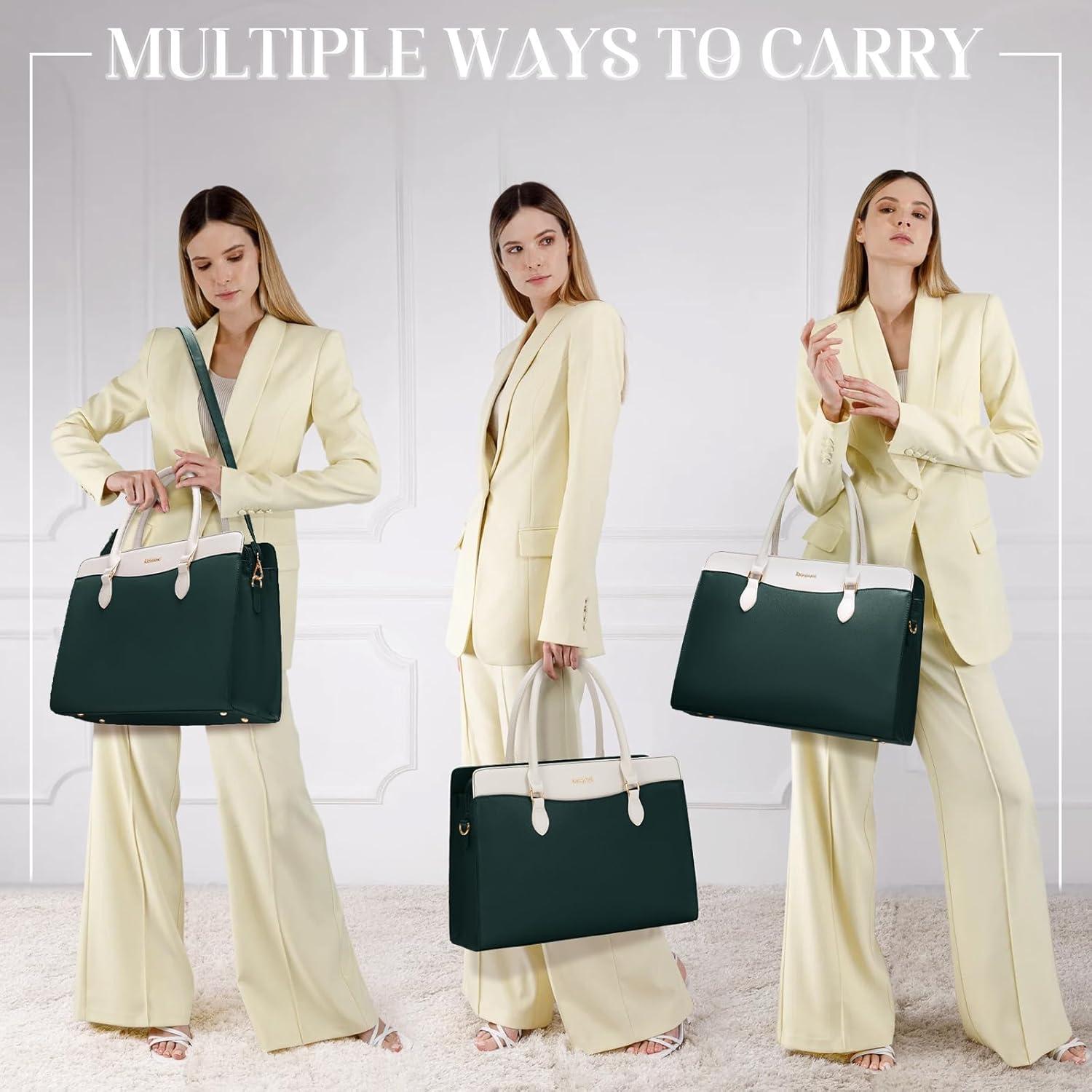 imageRAINSMORE Laptop Bag for Women 156 Inch Work Tote Bags Leather Laptop Tote Waterproof Computer Bag Professional Office Business Briefcase Large Handbag for College Teacher Travel BlackBeige and Green