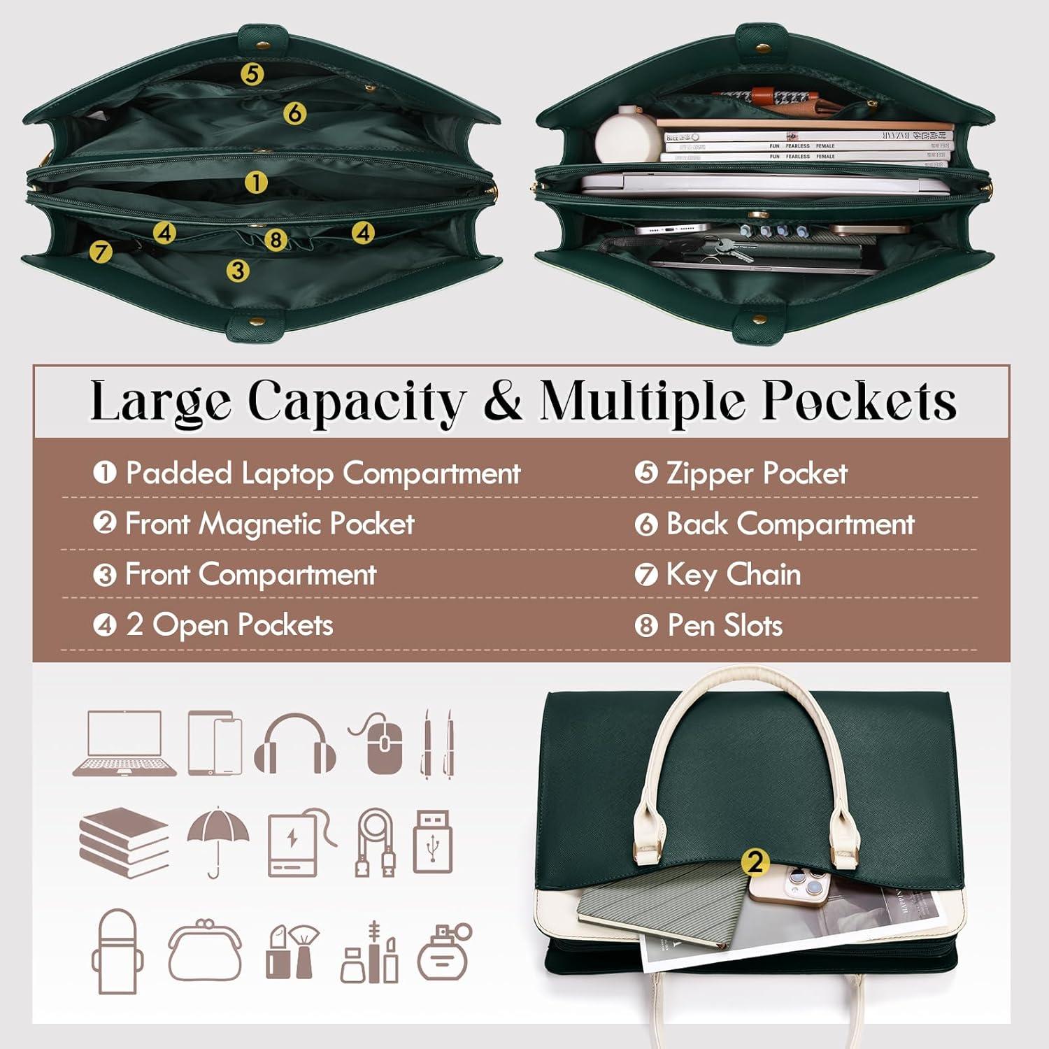 Spacious & Multiple Pockets – Dimensions of the womens laptop bag: 16.92(L)* 5.51(W)* 12.59(H) inch. Equipped with 1 front magnetic clasp pocket for passports, cosmetics, wallet, etc. There are 2 spacious magnetic clasp compartments, including 2 slip pockets, 4 pen slots, 1 key chain, and 1 zipper pocket, which not only accommodates all your items, such as A4 documents, pens, books, etc. but also keeps the laptop bag organized. Reasonable partition, say goodbye to clutter.