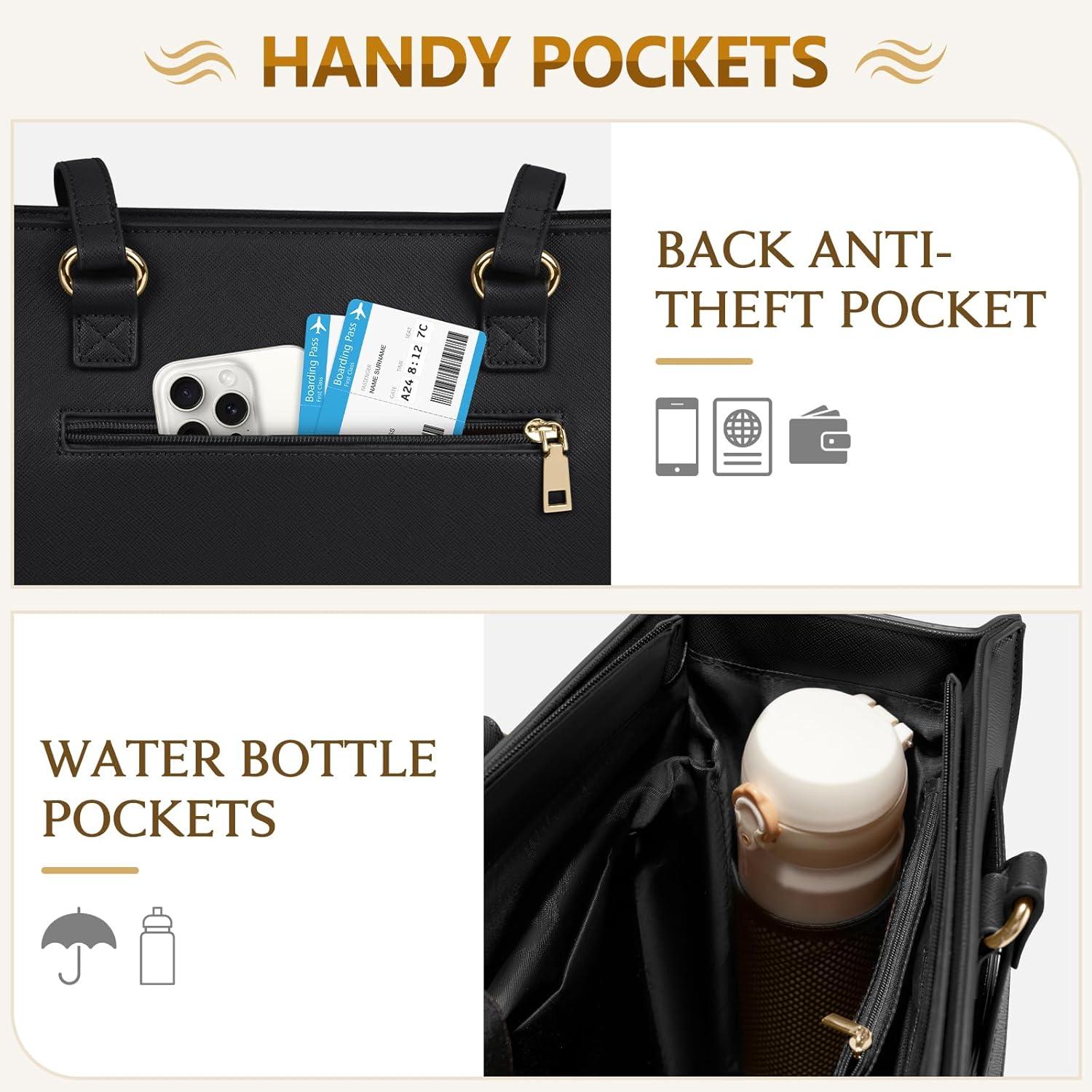 DURABLE WORK BAGS FOR WOMEN: Crafted from high-quality PU leather and premium polyester lining, this tote bag for women work is available for long-term use. Water-resistant material protects devices from spills. Sturdy gold hardware and reinforced stitching enhance the durability of laptop purse. Secure & smooth zip-top closure keeps your belongings safe.