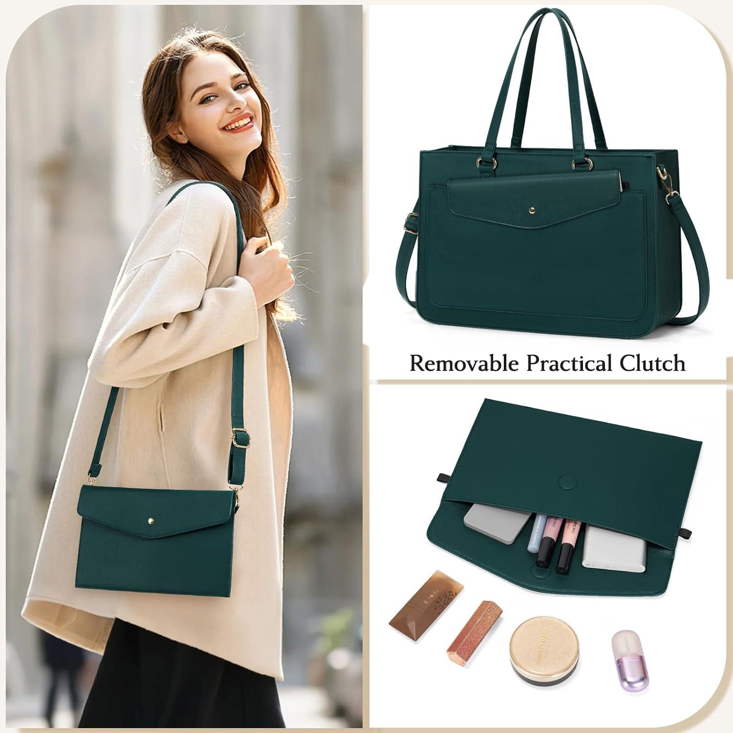 2 IN 1 LAPTOP TOTE BAG: This leather womens laptop bag comes with an additional clutch bag(11.4″ L x 6.7″ H), perfect for storing small accessories, cables, cards, glasses and makeup, complementing the computer bag for coordination of fashion and functionality. The adjustable shoulder strap is 22.4″-44.8″ long, which can suit women of all heights and comfortable for wearing, making this bag easily transform into a briefcase for women, work shoulder bag, or laptop crossbody bag
