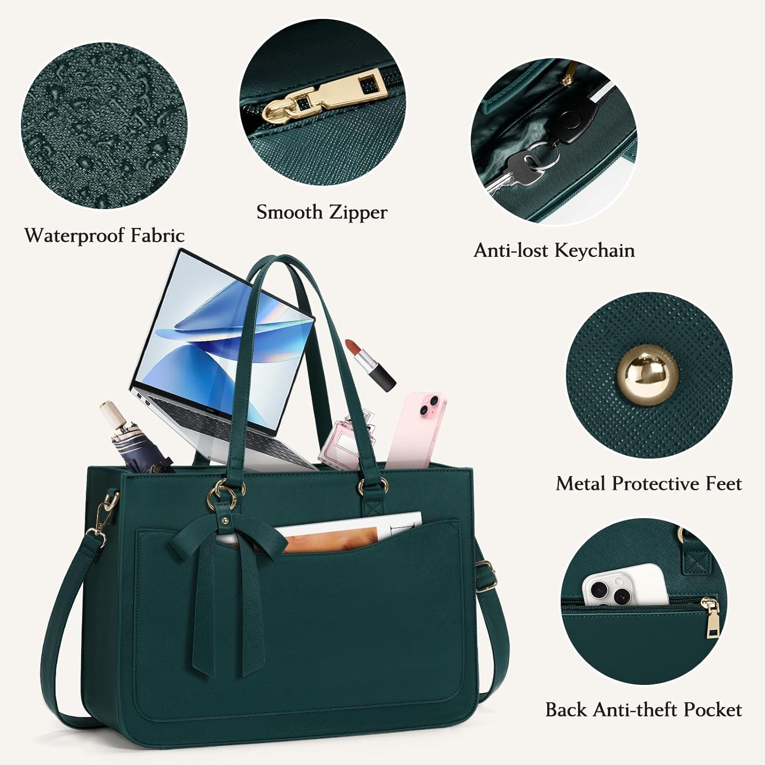 RAINSMORE Laptop Bag for Women 15.6 Inch Work Tote Bags Leather Laptop Tote Waterproof Computer Bag Professional Office Business Briefcase Large Handbag for College Teacher Travel, Black(Green)