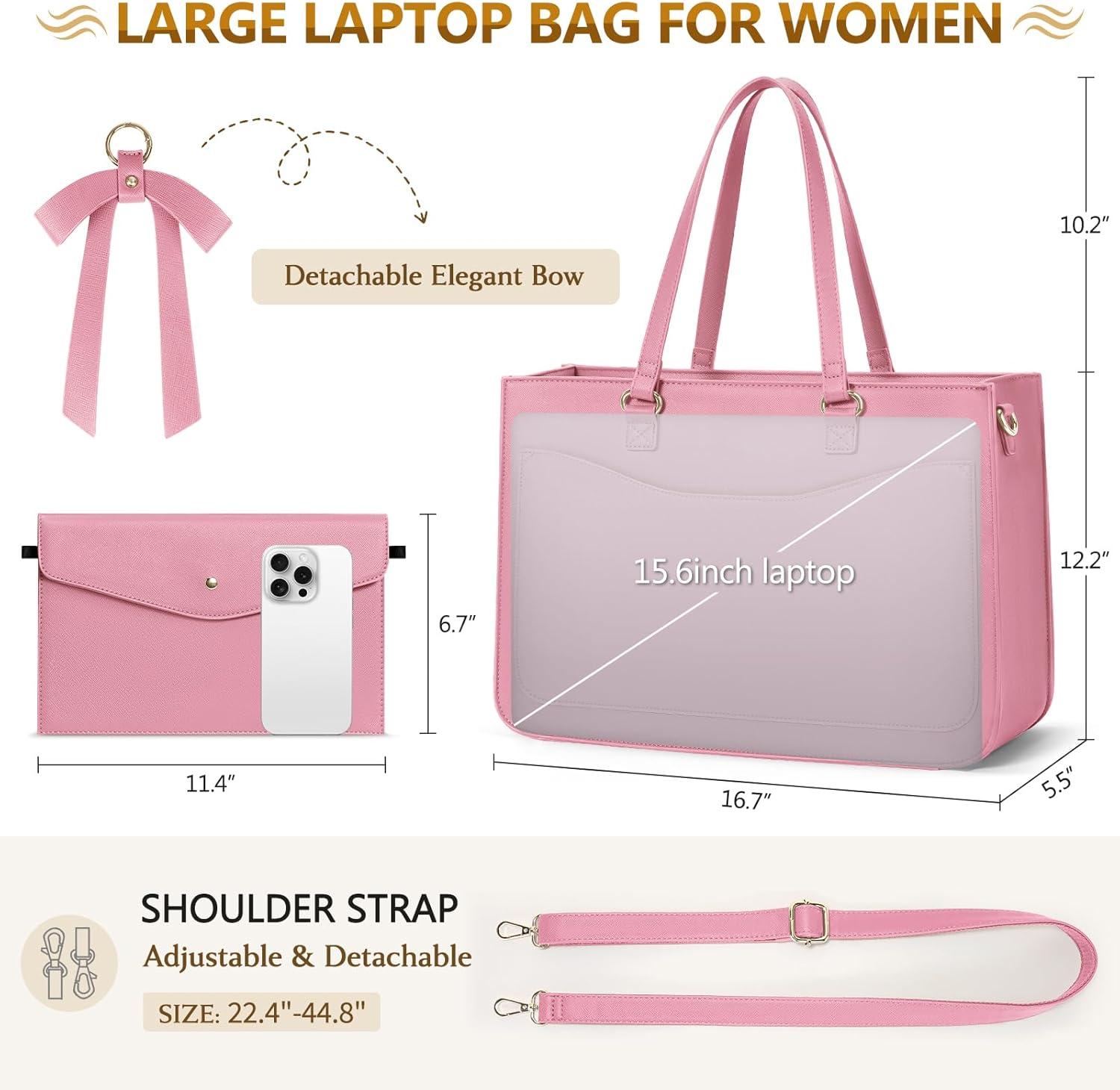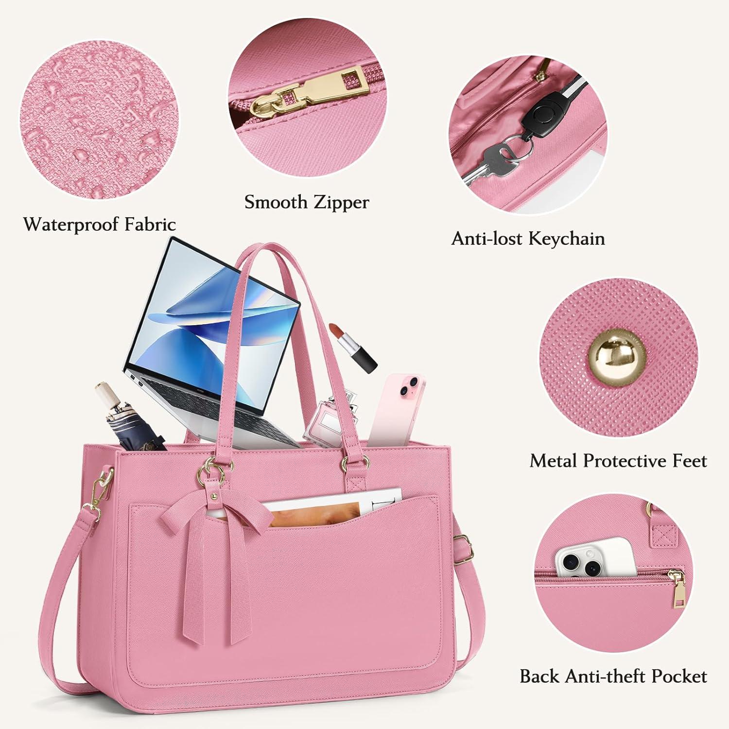 RAINSMORE Laptop Bag for Women 15.6 Inch Work Tote Bags Leather Laptop Tote Waterproof Computer Bag Professional Office Business Briefcase Large Handbag for College Teacher Travel, Black(Pink)