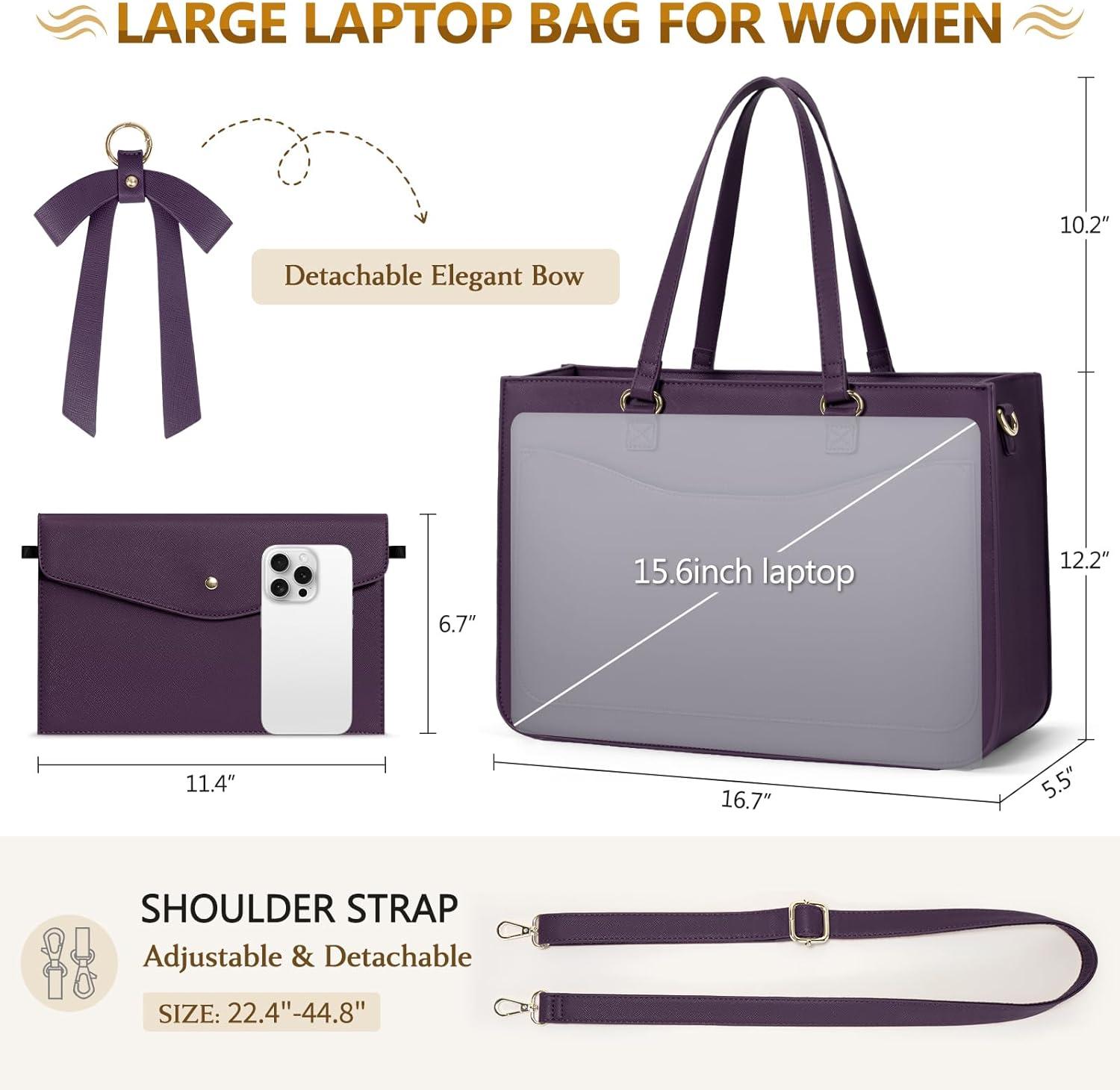 2 IN 1 LAPTOP TOTE BAG: This leather womens laptop bag comes with an additional clutch bag(11.4″ L x 6.7″ H), perfect for storing small accessories, cables, cards, glasses and makeup, complementing the computer bag for coordination of fashion and functionality. The adjustable shoulder strap is 22.4″-44.8″ long, which can suit women of all heights and comfortable for wearing, making this bag easily transform into a briefcase for women, work shoulder bag, or laptop crossbody bag