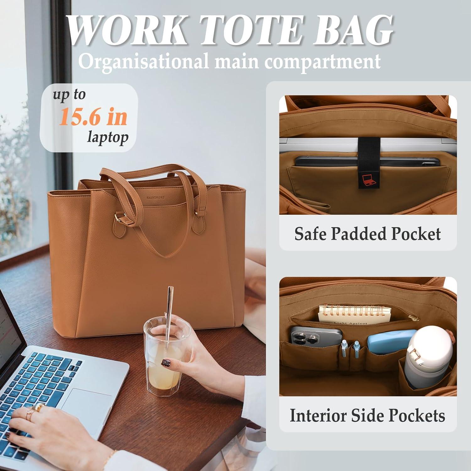 imageRAINSMORE Laptop Bag for Women 156 Inch Work Tote Bags Waterproof Computer Bags Leather Professional Laptop Purse Womens Laptop Briefcase Large Handbag for Office Teacher Travel BlackBrown