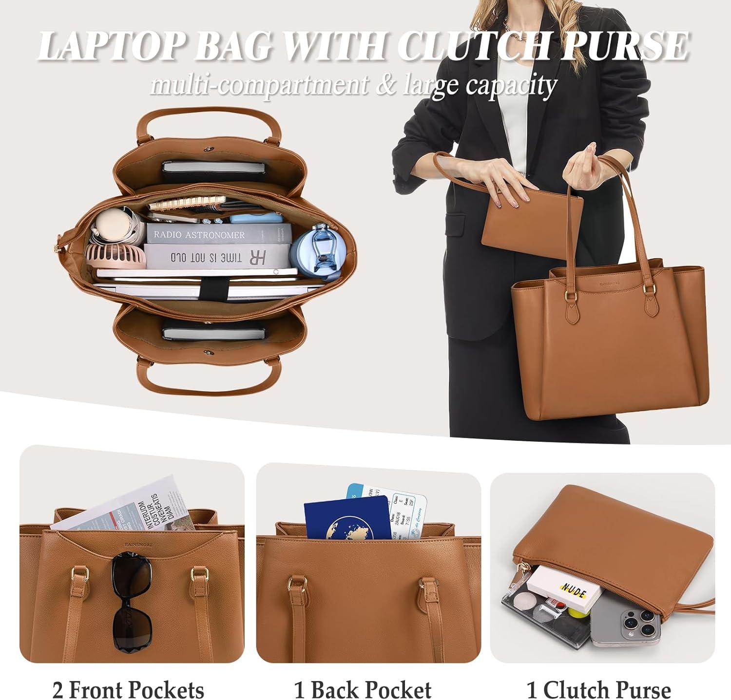 LAPTOP BAG WITH CLUTCH PURSE: This laptop tote bag also comes with a clutch purse to hold small essentials such as phones, keys, cards, glasses, or cosmetics. The compact size make it easy to hang from your wrist, or slip into the large laptop tote. Designed to be stylish and practical, this office bags for women is perfect for every woman who needs to carry a decent amount of stuff. This well made and beautiful tote bag for women is also a great gift for mom, wife, daughter or friend.