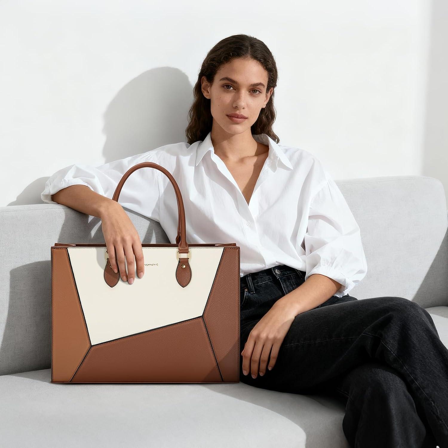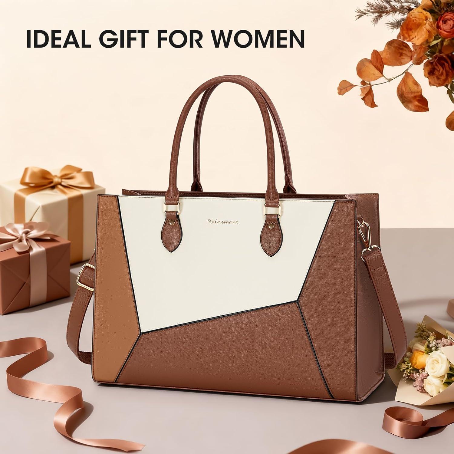 RAINSMORE Laptop Tote Bag for Women 15.6 Inch Large Women Work Bags Waterproof Business Office Teacher Bag Computer Briefcase(Brown&white)