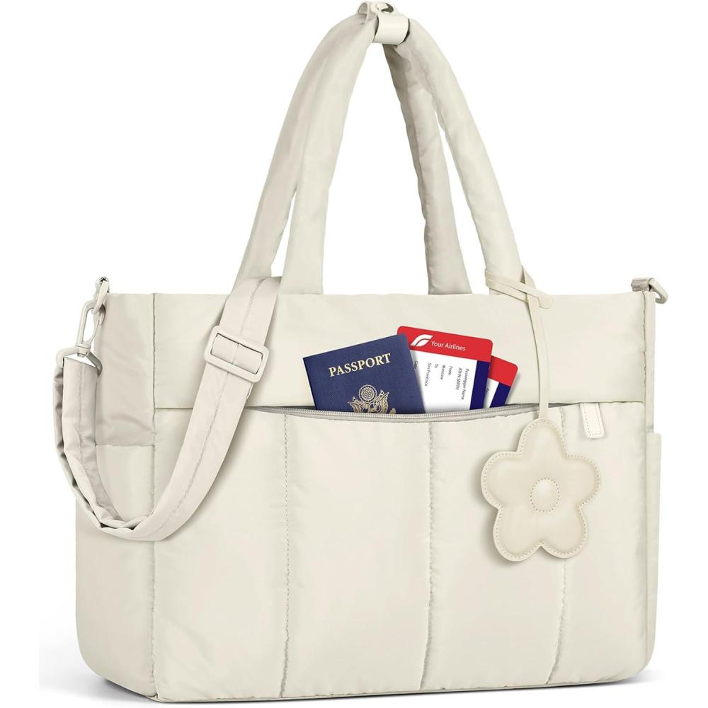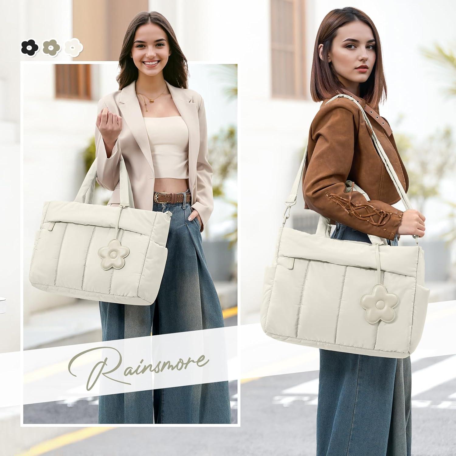 RAINSMORE Laptop Tote Bag for Women 15.6 Inch Lightweight Puffer Work Tote Bag Quilted Travel Bags with Shoulder Strap Large Computer Briefcase Teacher Nurse Bag for Casual Office Travel, Beige(Beige)