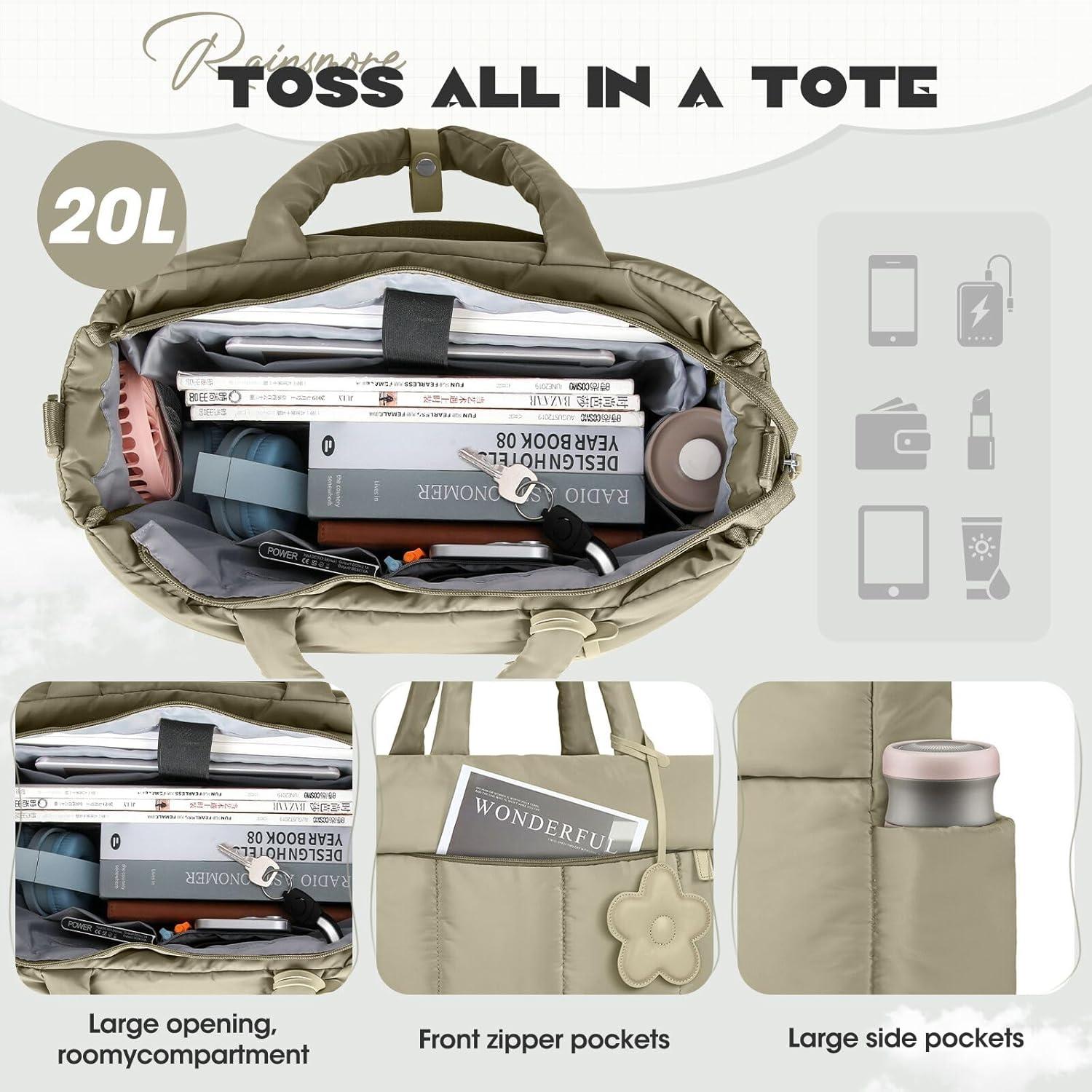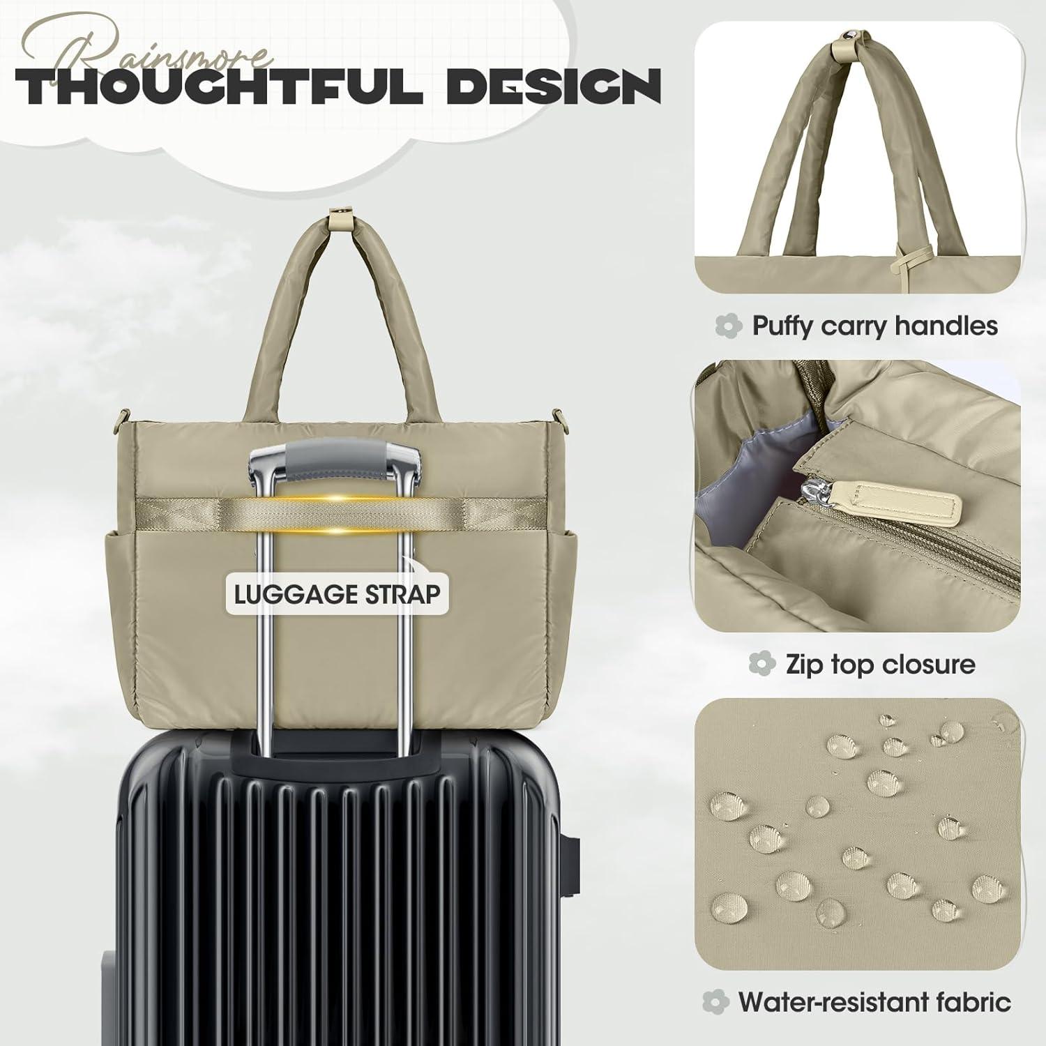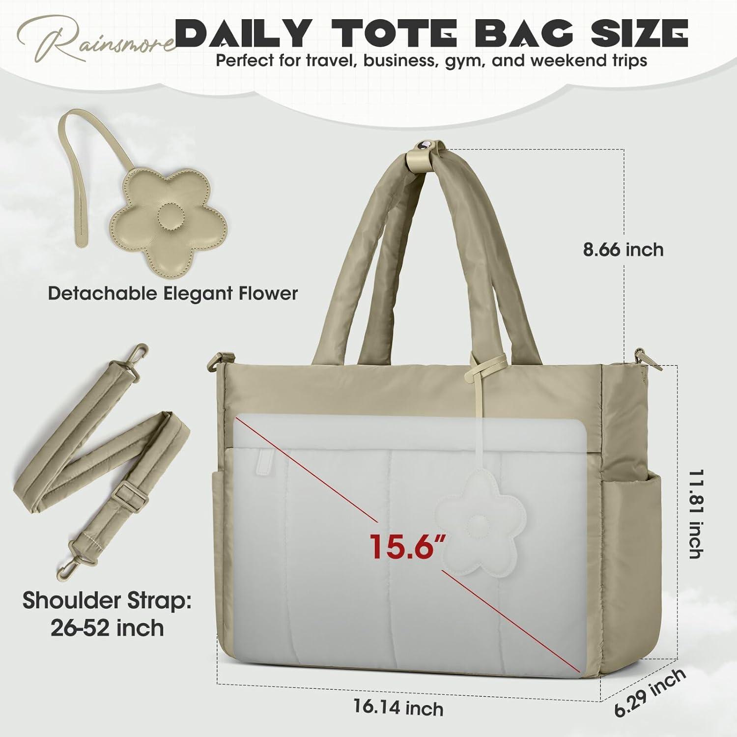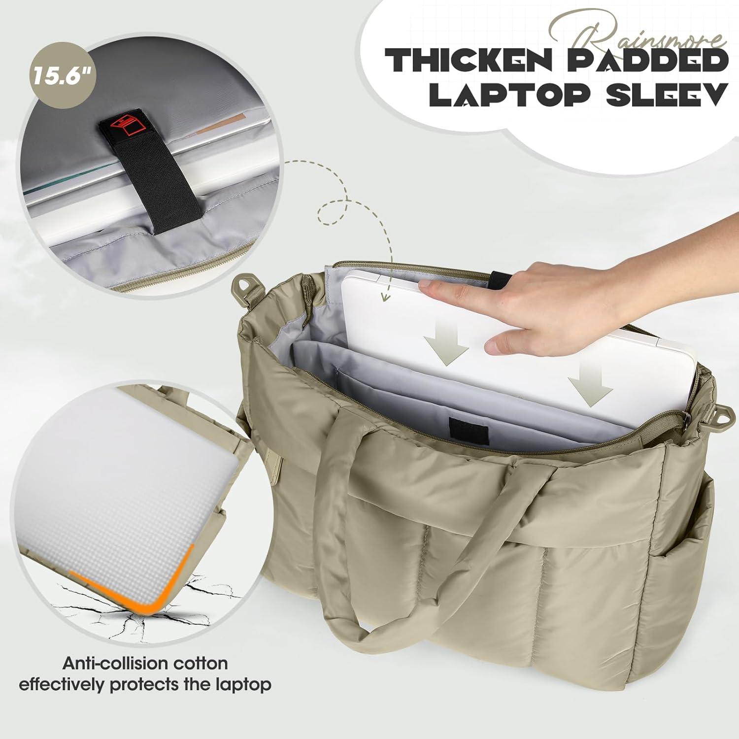 imageRAINSMORE Laptop Tote Bag for Women 156 Inch Lightweight Puffer Work Tote Bag Quilted Travel Bags with Shoulder Strap Large Computer Briefcase Teacher Nurse Bag for Casual Office Travel BeigeKhaki