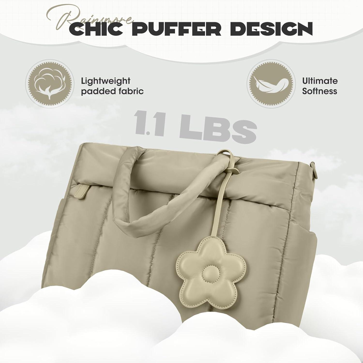 RAINSMORE Laptop Tote Bag for Women 15.6 Inch Lightweight Puffer Work Tote Bag Quilted Travel Bags with Shoulder Strap Large Computer Briefcase Teacher Nurse Bag for Casual Office Travel, Beige(Khaki)