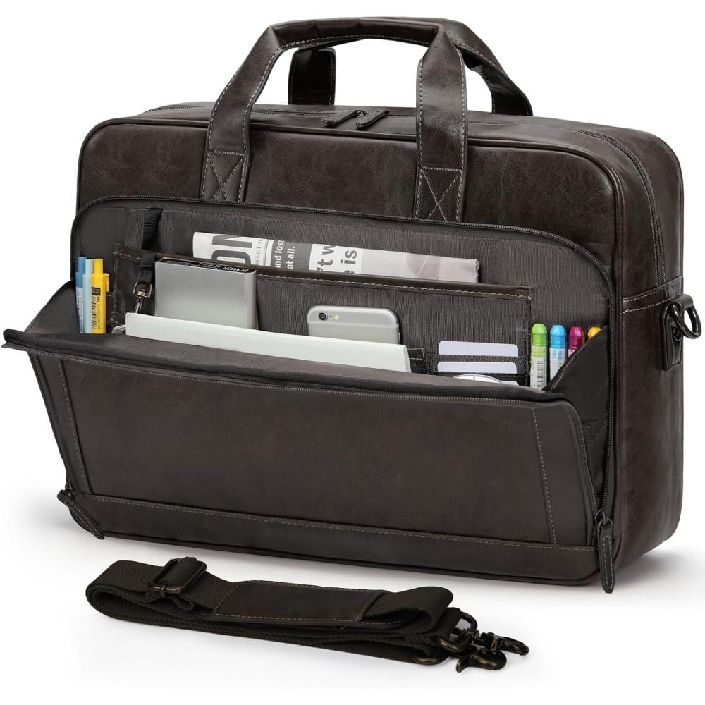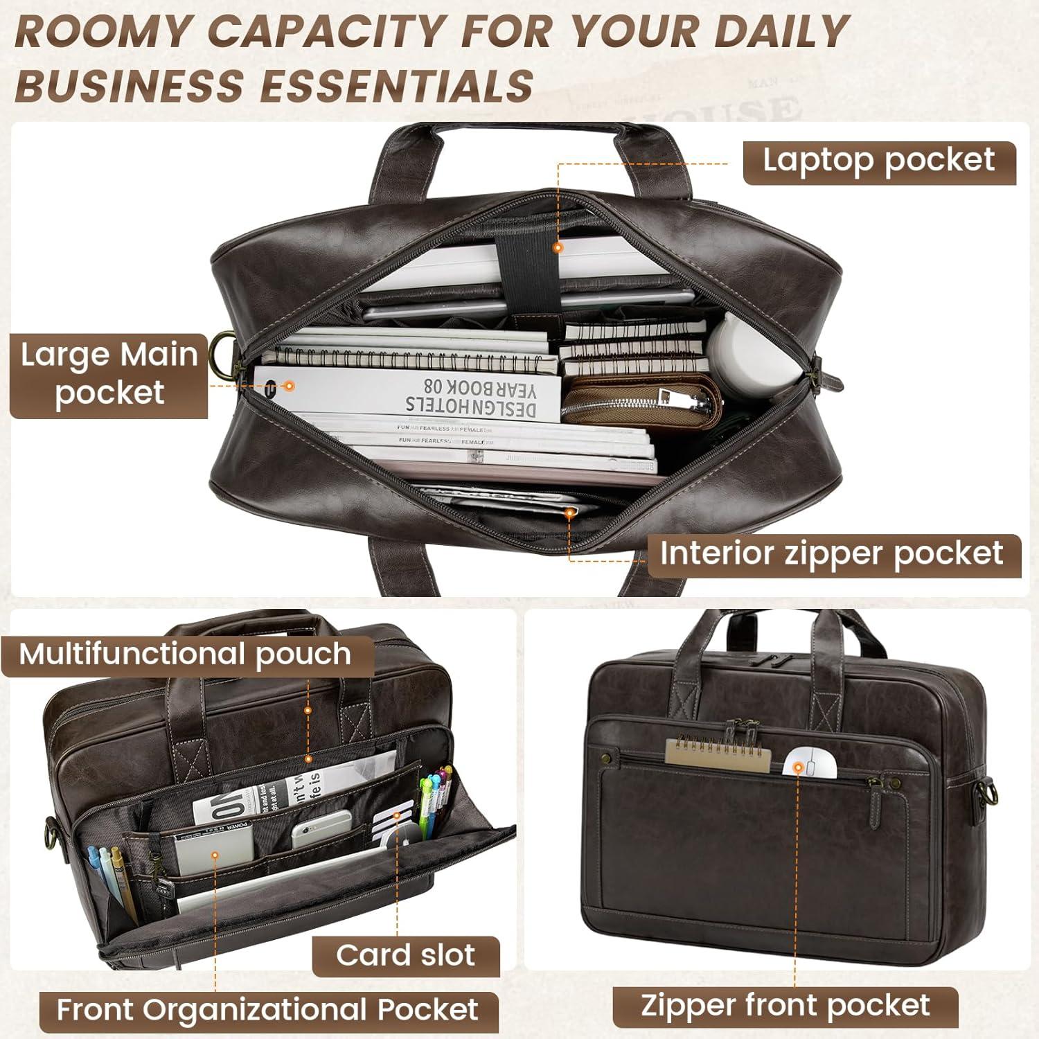 Large Capacity & Multiple Pockets: The leather laptop bag has spacious compartments that provide separate space for a 16 inch laptop, iPad, documents, and all your belongings. It has multiple pockets, including a padded laptop pocket and a main compartment with a zippered pocket. The front compartment has multiple slots and a keychain. There is a front zipper pocket for easy access to personal items. It keeps everything organized and within reach, which is a perfect business briefcase for men.