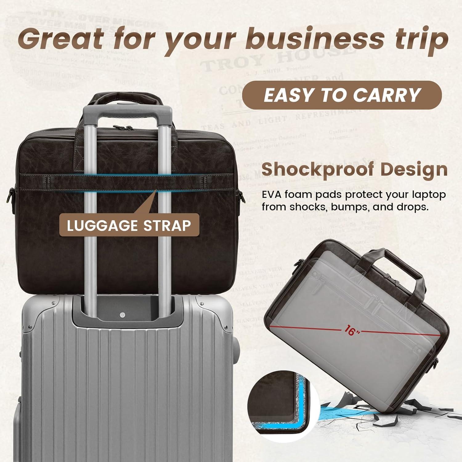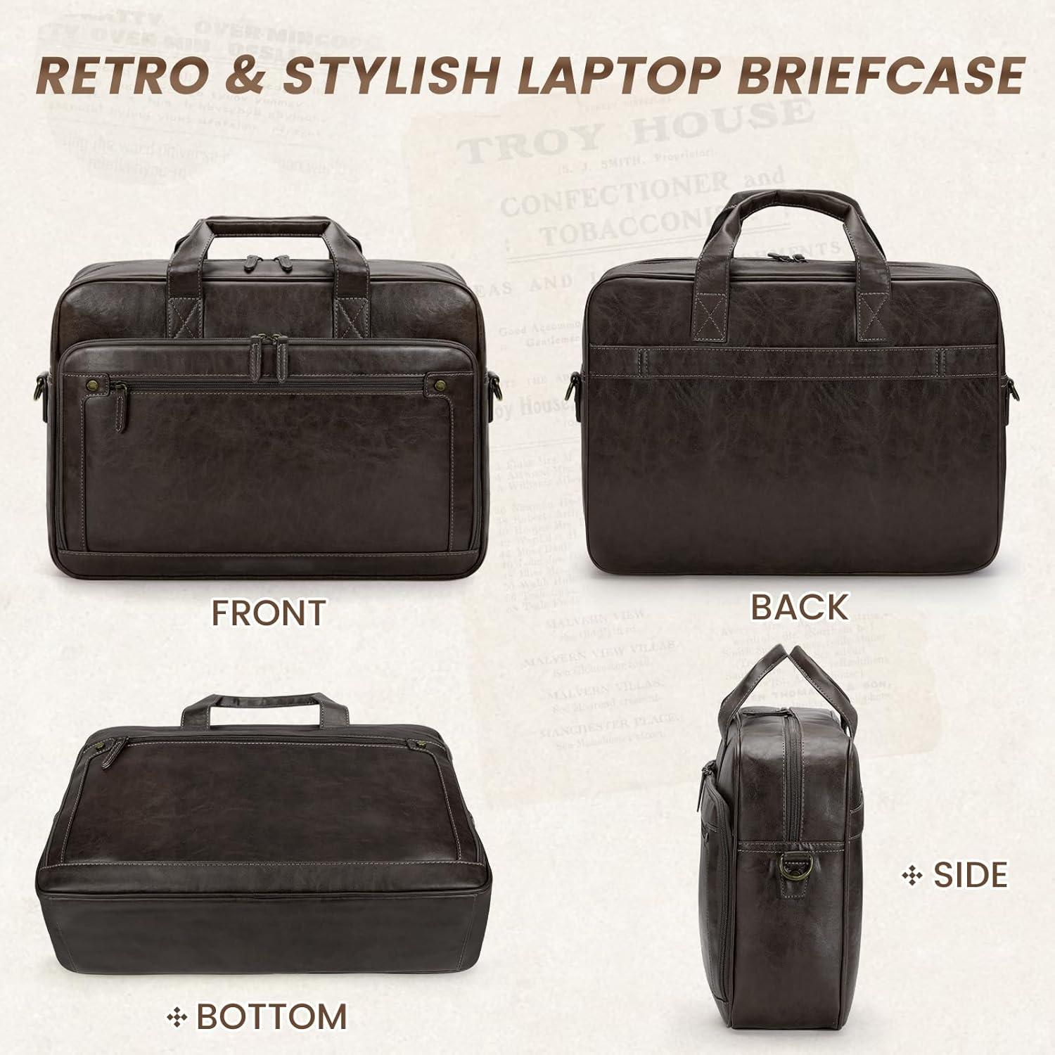 Durable & Vintage Laptop Briefcase: This laptop briefcase is made of soft-textured PU leather with a cowhide pattern and features metal zippers, durable antique brass hardware, and strong stitching for long-lasting reliability. The thick nylon lining and protective foam compartment ensure that your laptop is protected from impacts. Its design seamlessly blends practicality and style, making it a standout leather laptop bag for men, an essential briefcase, and a professional work bag.