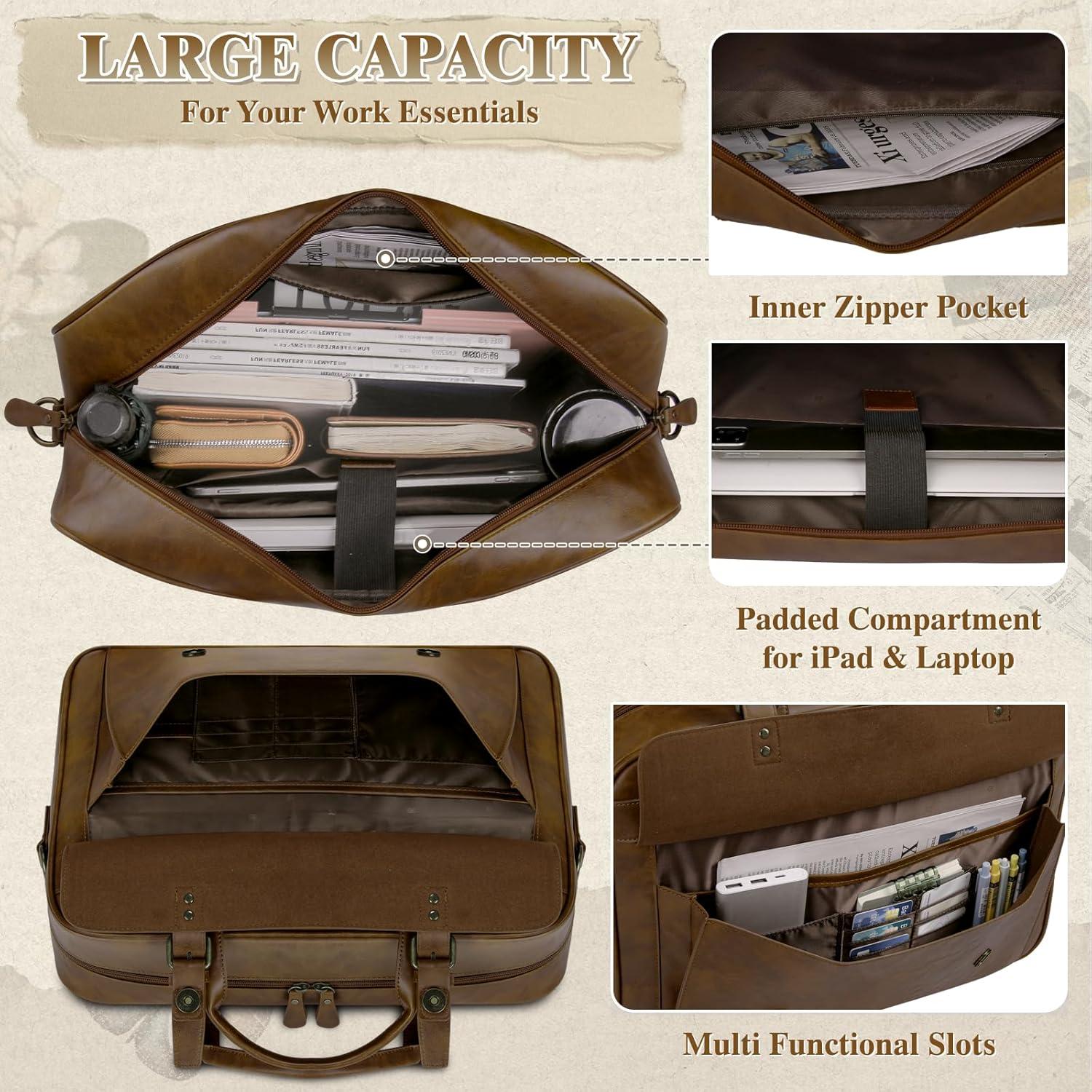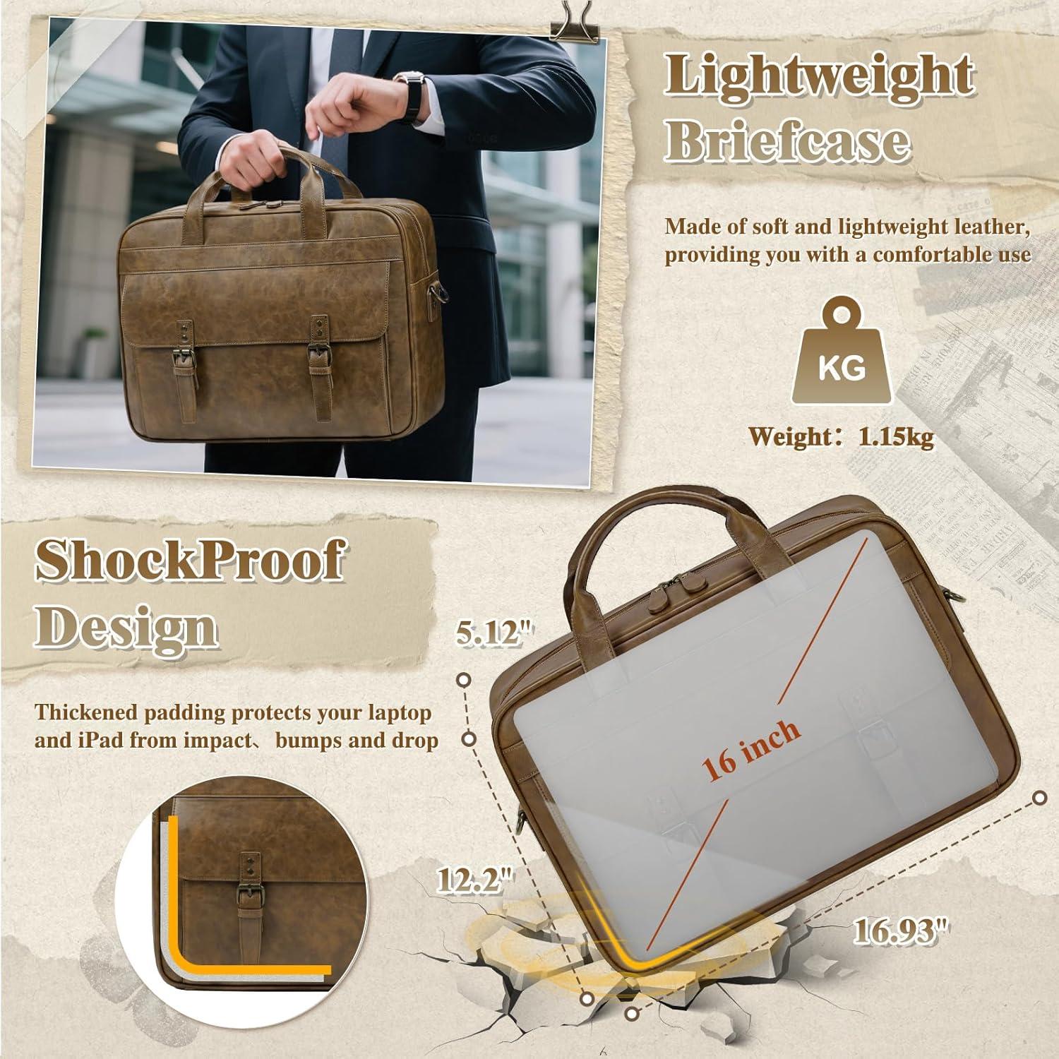 imageRAINSMORE Messenger Bag for Men 16 Inch Laptop Bag Vintage Leather Waterproof Laptop Briefcases Large Computer Satchel BagBrown