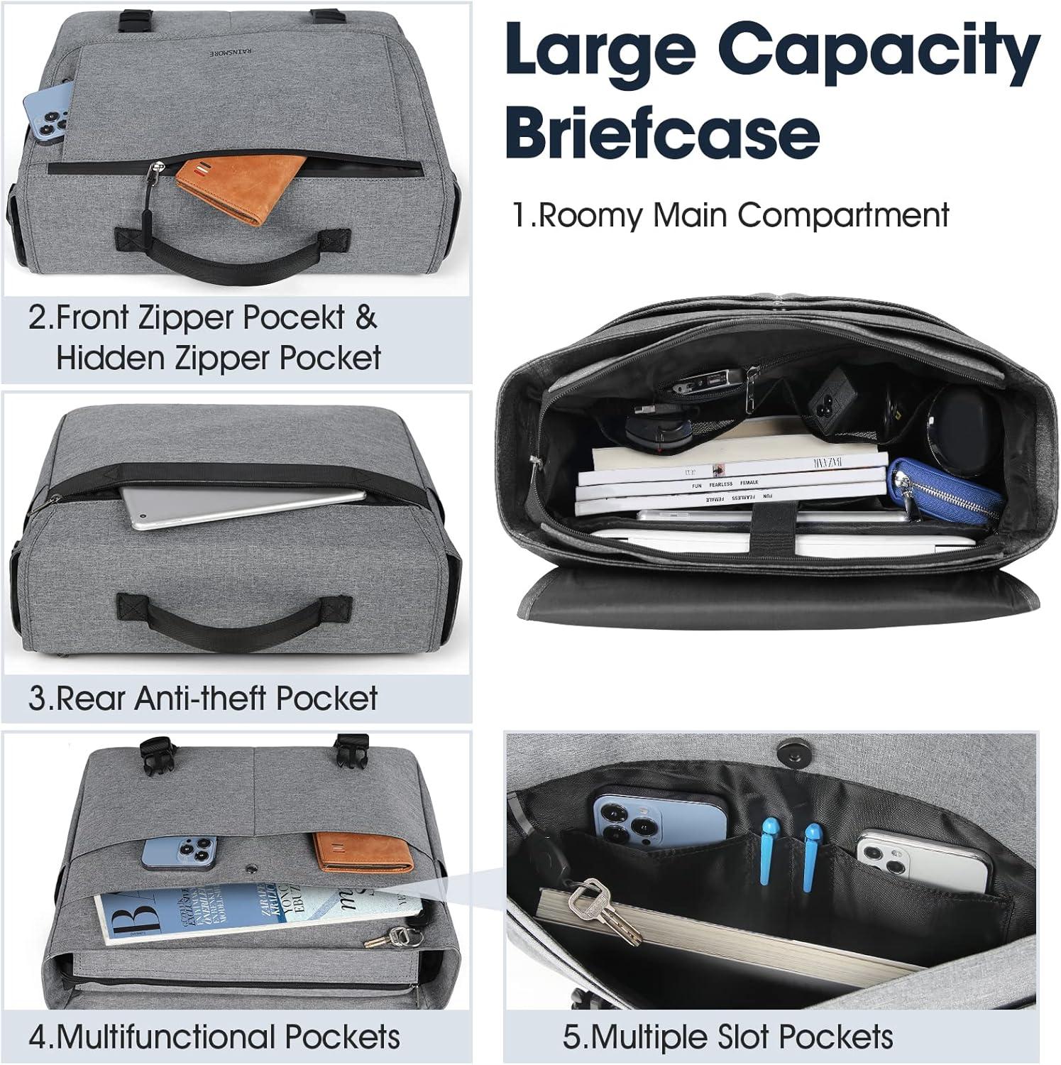 【Roomy Organizer Briefcase】 The laptop briefcase is roomy to keep your items organized. There has 5 pockets on the outside of the bag. Under the cover, there also has 1 main padded pocket with a thick foam pad fits up to 15.6'' laptop. Also, it has multiple compartments to store books, document, folders and mouse. And has various separate pockets to store pen, business card or other small items. What's more, it has a detachable keychain can help you find your keys easily.