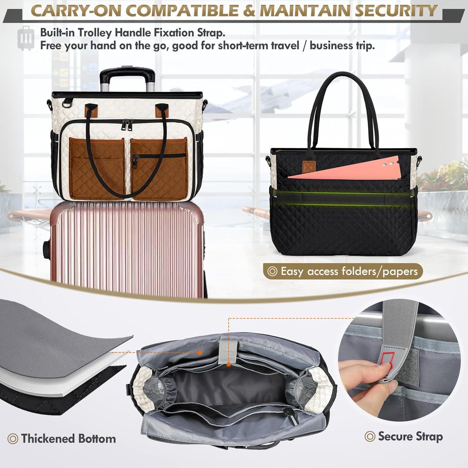 CONVENIENCE DESIGN FOR TRAVELERS- The luggage strap in the back allows this women tote bag to slide over the luggage tube, to free your hand on the go. The standard size of this women laptop bag makes this a good airplane travel bag, it is able to fit in the overhead bin and under seat space. The laptop bag for women also provides multiple ways of carrying, it can serve as a shoulder bag, office bag, laptop carrying bag, or laptop cross-body bag