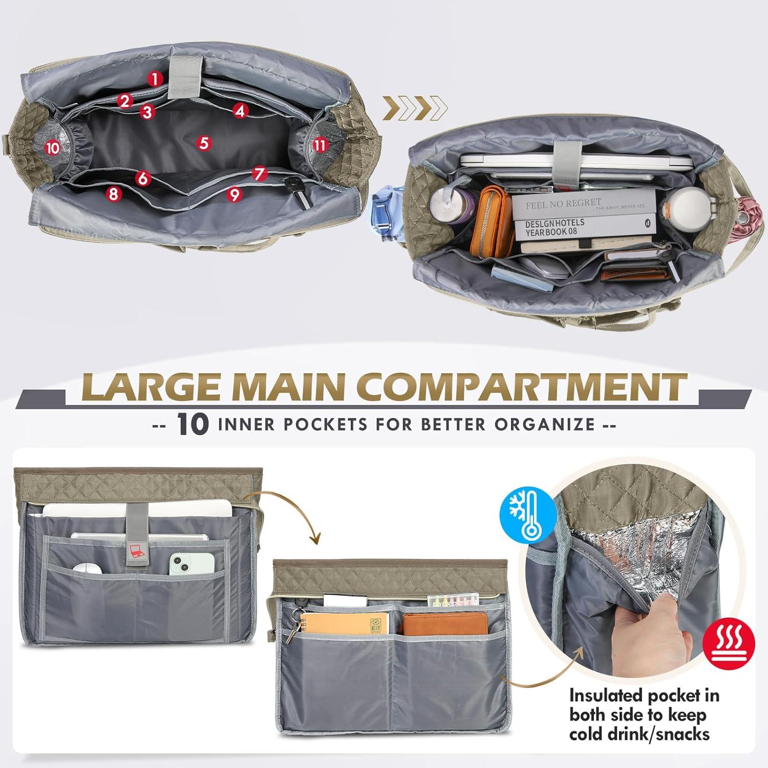 LARGE CAPACITY & MULTIPLE STORAGE- The large main compartment of this teacher laptop bag with 10 inner pockets could easily hold all your daily necessities/college supplies/teaching materials/medical supplies in an organized way. The padded laptop compartment of this teacher tote bag offers optimal protection, which can fit in a 15.6″ laptop and a 12.9″ iPad. Insulated pockets on both sides are designed for snacks or coffee storage and keep cold or warm for hours