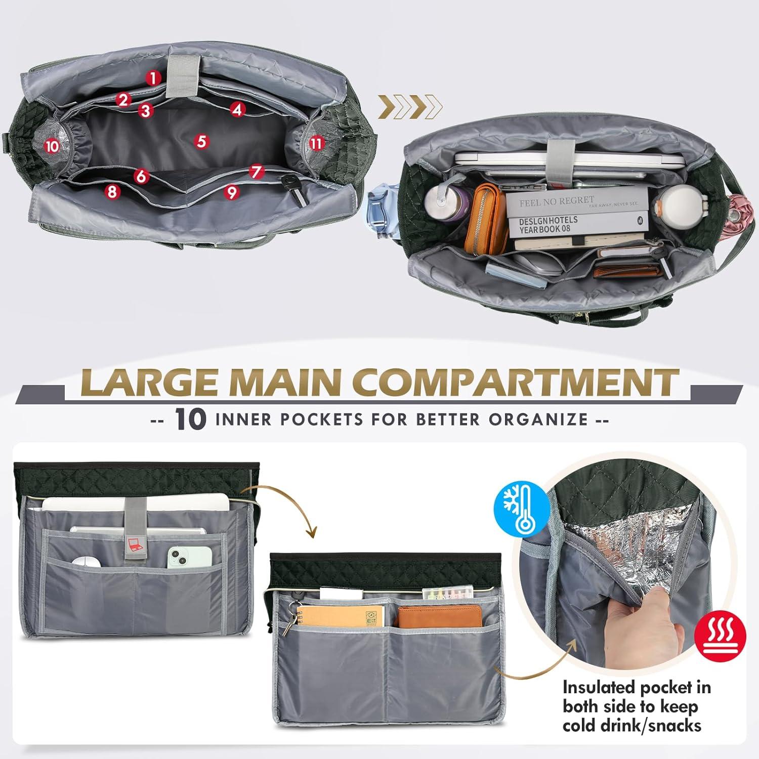 LARGE CAPACITY & MULTIPLE STORAGE- The large main compartment of this teacher laptop bag with 10 inner pockets could easily hold all your daily necessities/college supplies/teaching materials/medical supplies in an organized way. The padded laptop compartment of this teacher tote bag offers optimal protection, which can fit in a 15.6″ laptop and a 12.9″ iPad. Insulated pockets on both sides are designed for snacks or coffee storage and keep cold or warm for hours