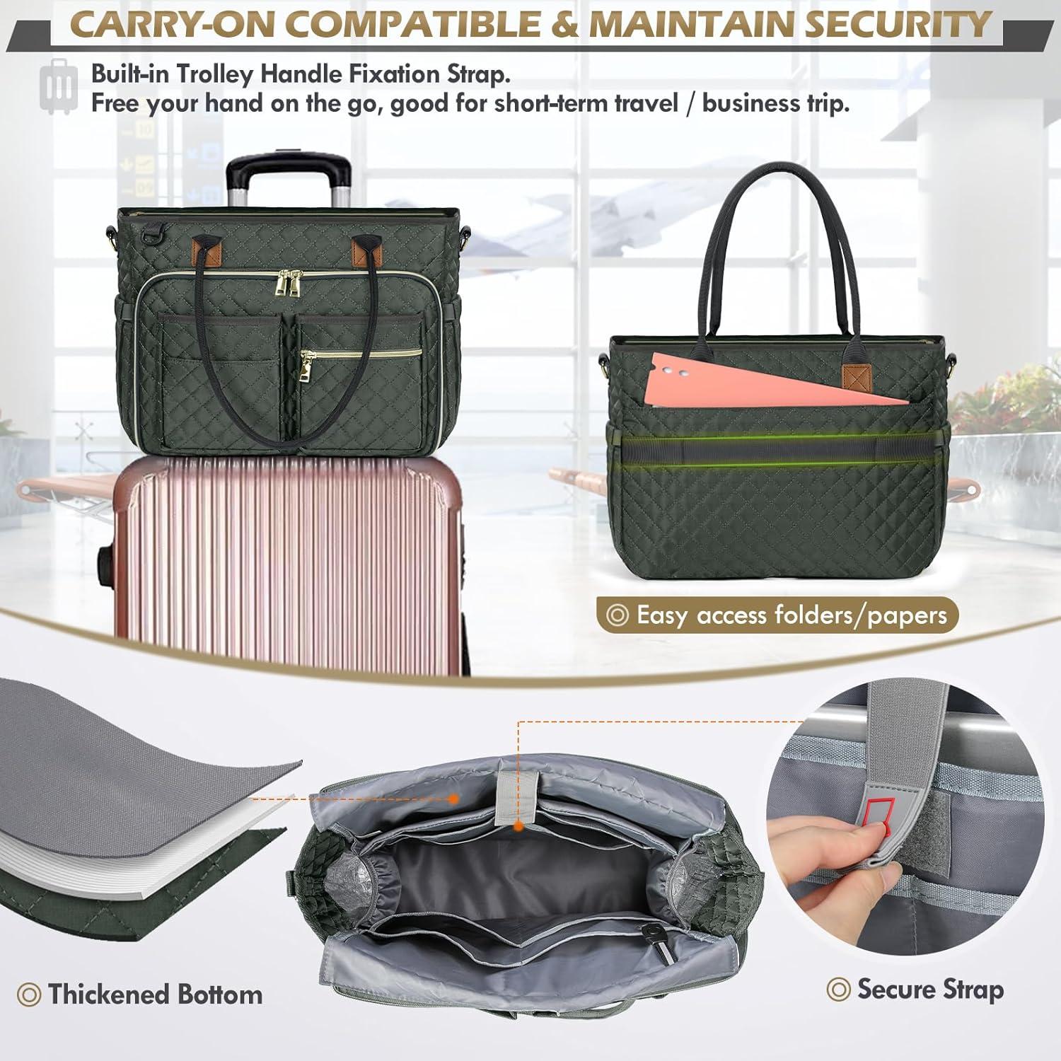 CONVENIENCE DESIGN FOR TRAVELERS- The luggage strap in the back allows this women tote bag to slide over the luggage tube, to free your hand on the go. The standard size of this women laptop bag makes this a good airplane travel bag, it is able to fit in the overhead bin and under seat space. The laptop bag for women also provides multiple ways of carrying, it can serve as a shoulder bag, office bag, laptop carrying bag, or laptop cross-body bag