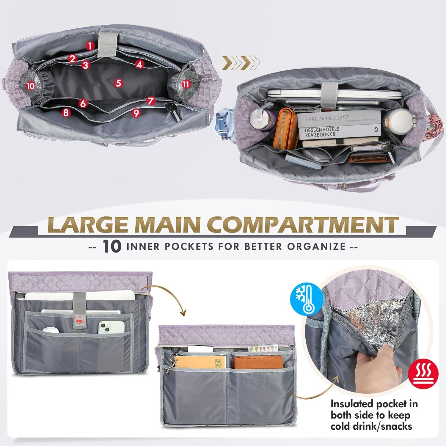 RAINSMORE Teacher Tote Bag 15.6 inch Laptop Bag for Women Work Bags Laptop Tote Nurse Bag Professional Computer Messenger with Insulated Pocket, Laptop Briefcase for Office, College, Nursing, Black(Gray Lilac)